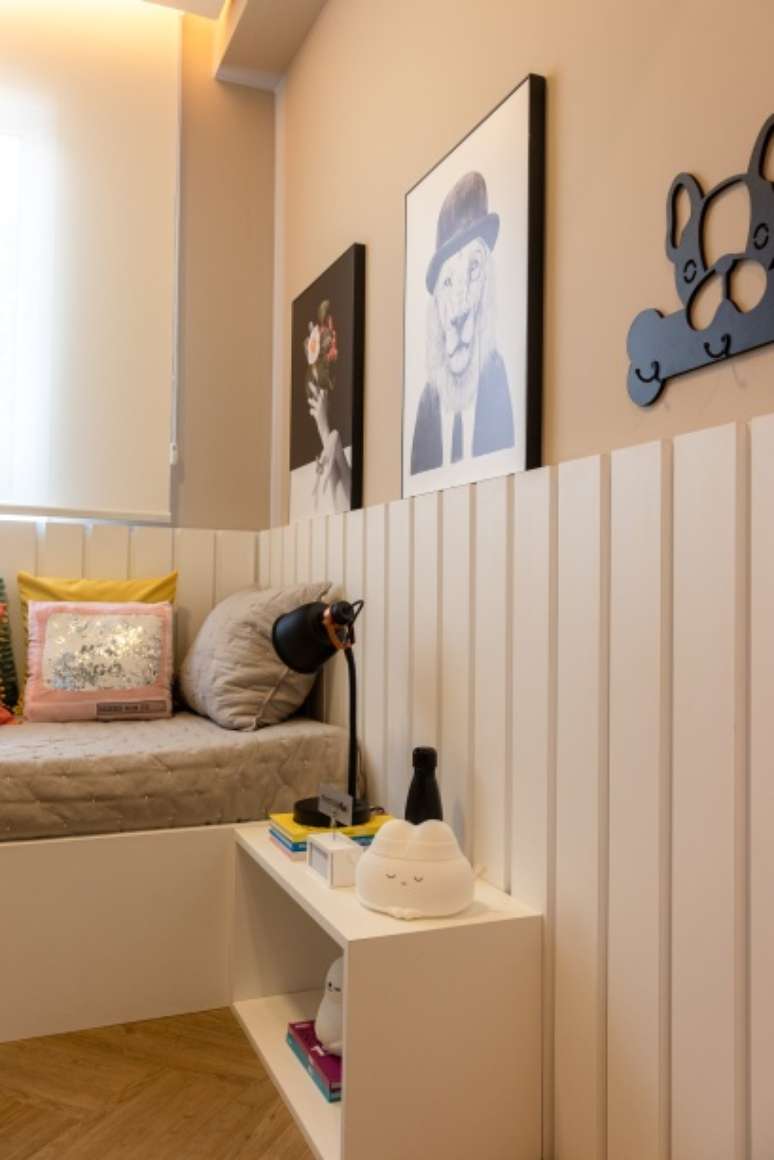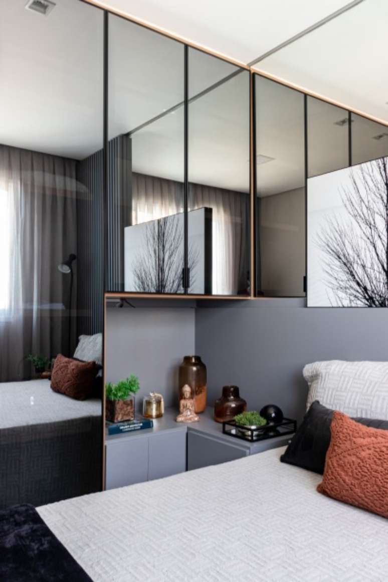 A ala íntima também conta com soluções que valorizam e dão mais amplitude. No quarto de casal, por exemplo, mesmo com um espaço limitado, o cômodo não deixa de ter comodidade, elegância e funcionalidade, tudo isso graças a marcenaria bem pensada.