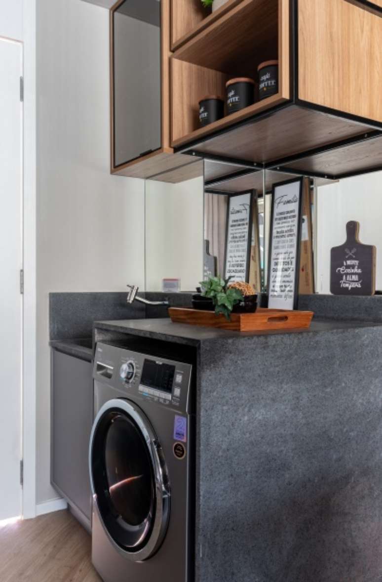 Um dos grandes desafios do projeto era aproveitar a área do apto com um olhar efetivo e que resultasse uma morada agradável. Para tanto, a utilização de uma marcenaria planejada e revestimentos para compor a divisão dos cômodos foram fundamentais.