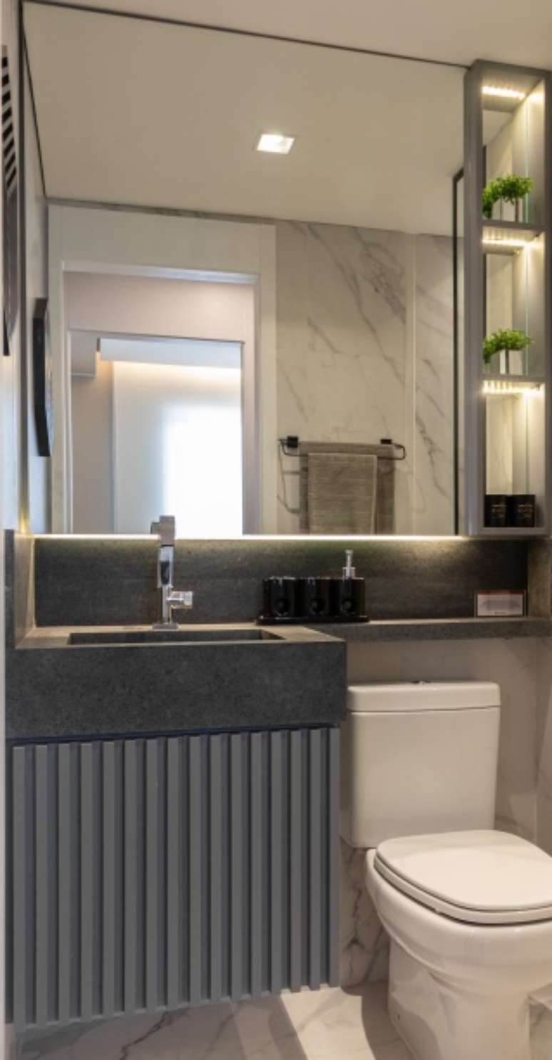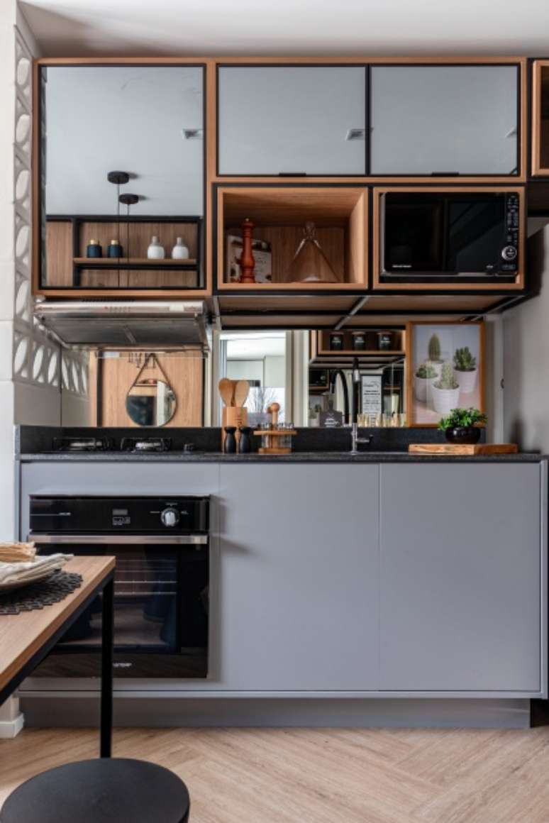 Na parte social, o mix entre cores neutras e escuras são predominantes, porém os dois espaços não ficam monótonos. "Nosso cliente queria um apartamento com uma paleta inspirada em tons de cinza e tampos escuros, uma combinação que, via de regra, não indicamos muito.