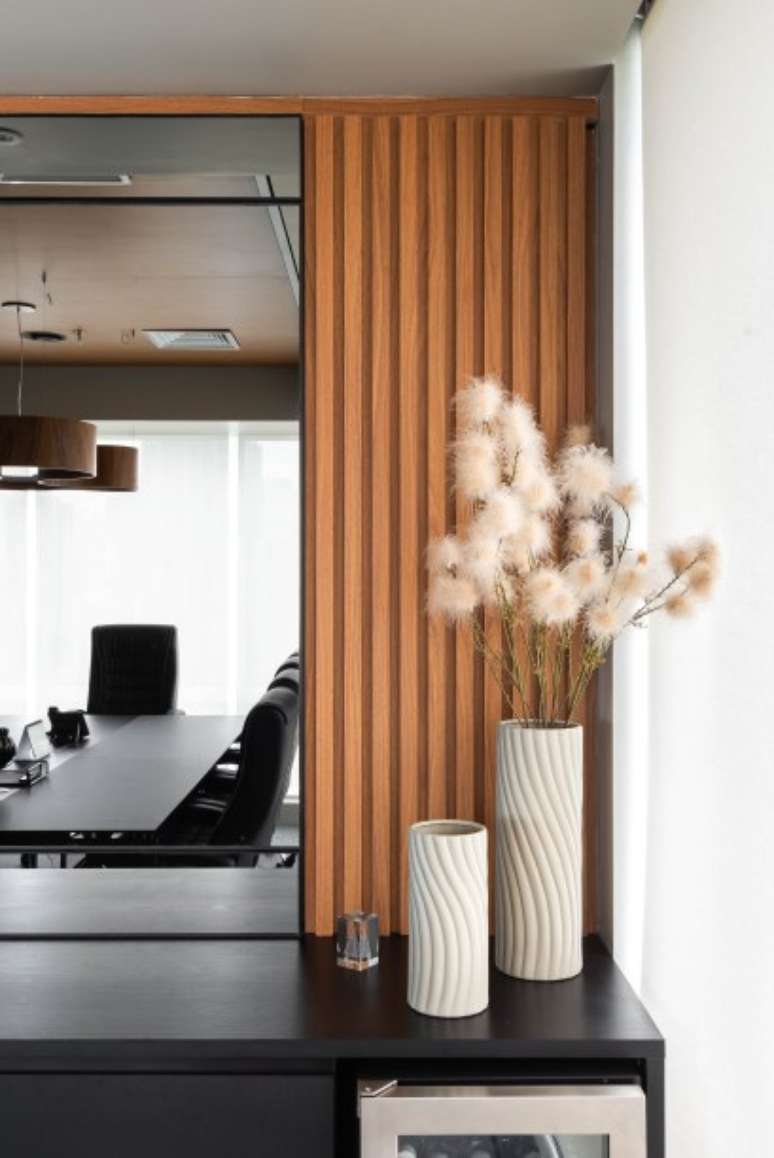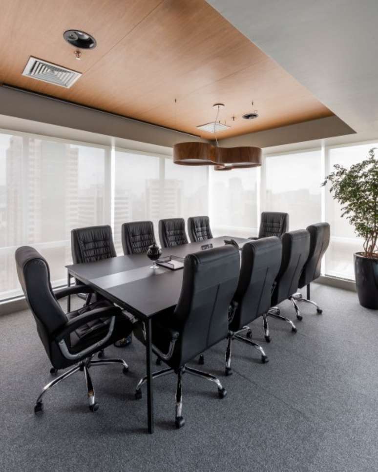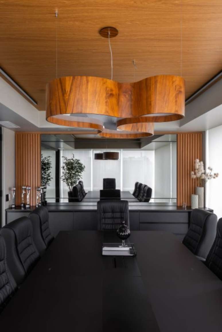 "As luminárias de madeira trazem um toque rústico para a sala de reunião, além de ter a capacidade de dispersar a luz suavemente e criar uma iluminação agradável e acolhedora. A iluminação proporcionada por ela é especialmente apropriada para espaços que requerem concentração", explica o especialista do Arqplace.
