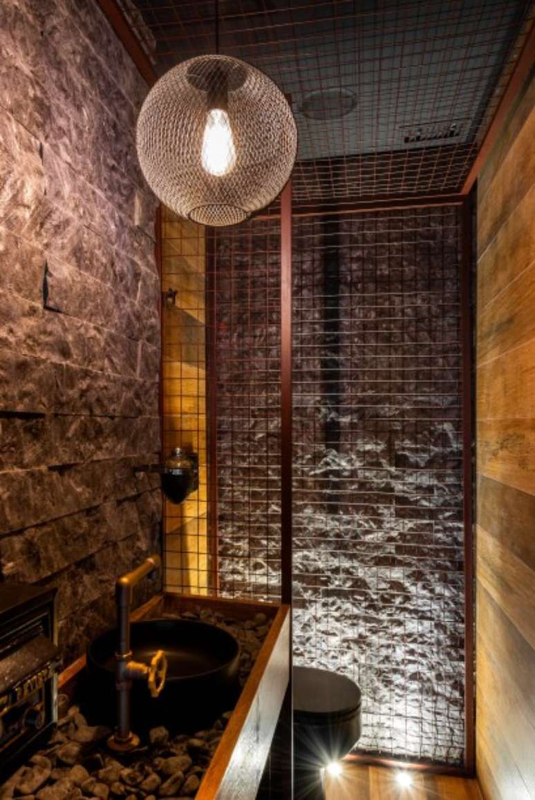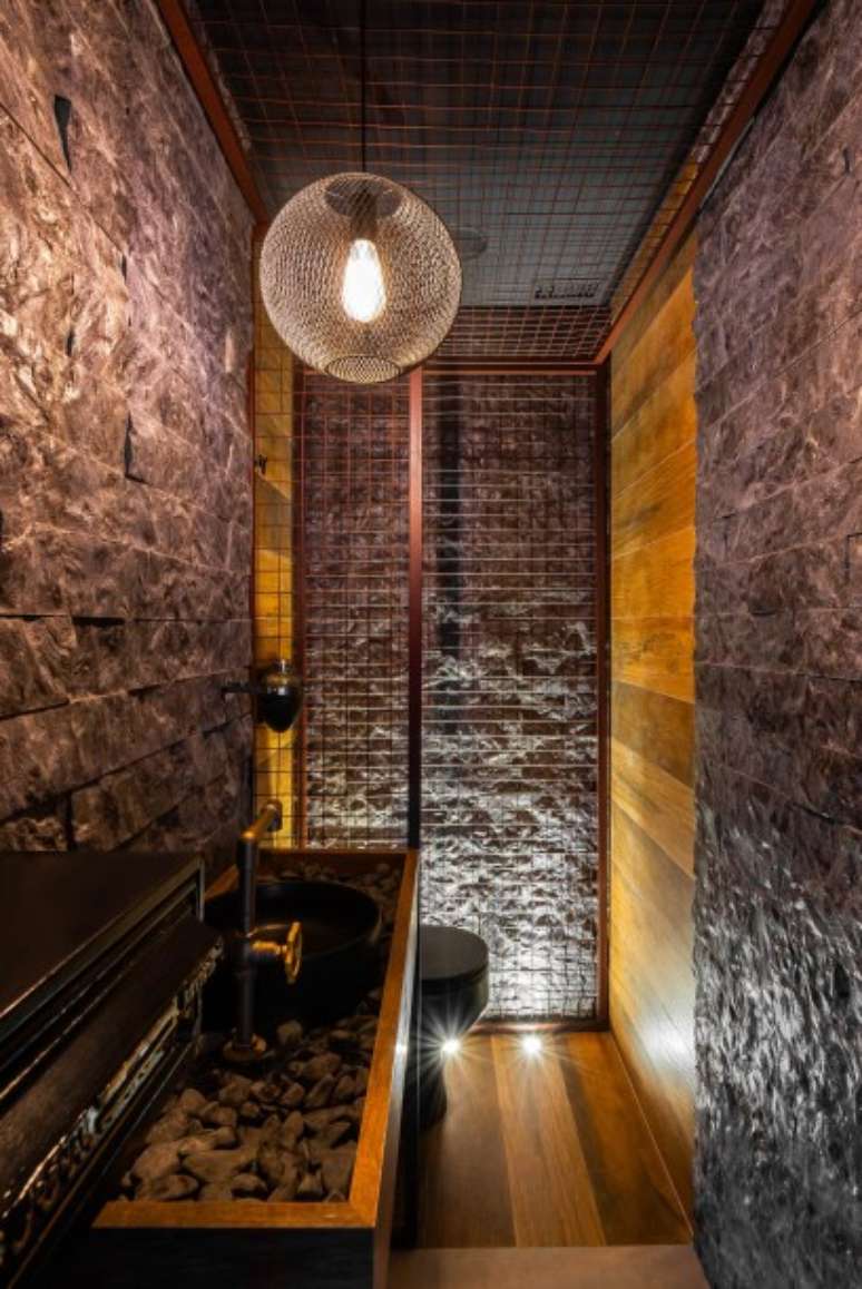 Um dos ambientes que saltam aos olhos é o banheiro revestido com o tijolinho pedra matrix, em tom cinza chumbo além de possuir um glitter natural, que além do alto grau de durabilidade e resistência oferece um ar clássico e elegante, que combina perfeitamente com elementos de metais e madeira, como nesta proposta.
