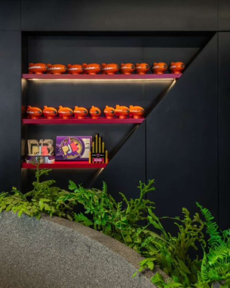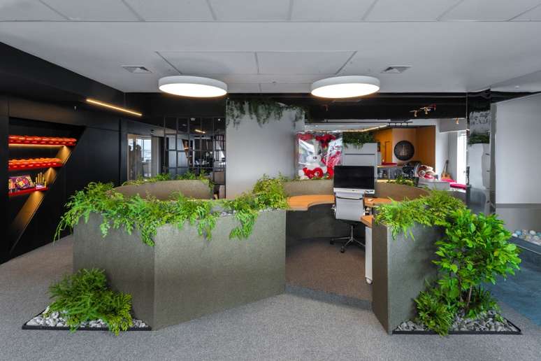 O projeto, assinado por Karina Marinho, com peças do Arqplace, tem sala de reuniões para 10 pessoas, espaço para presentes de fãs e estante de troféus