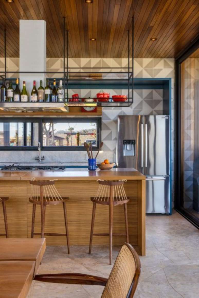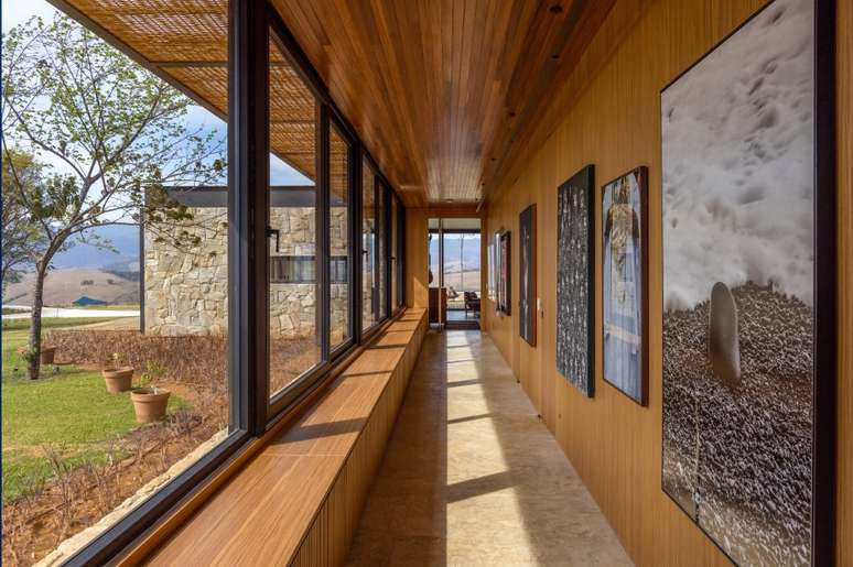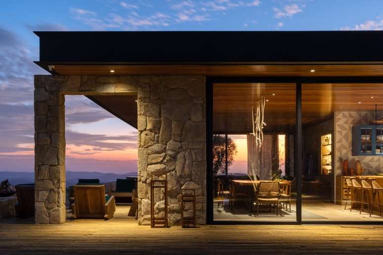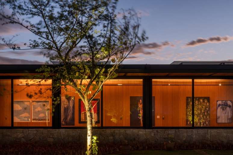 Com interiores assinados pela arquiteta Hana Lerner, o projeto possui sala de jantar, cozinha e estar integrados. E quase todas as janelas são de vidro, o que proporciona a integração com o exterior e o amplo uso de luz natural.