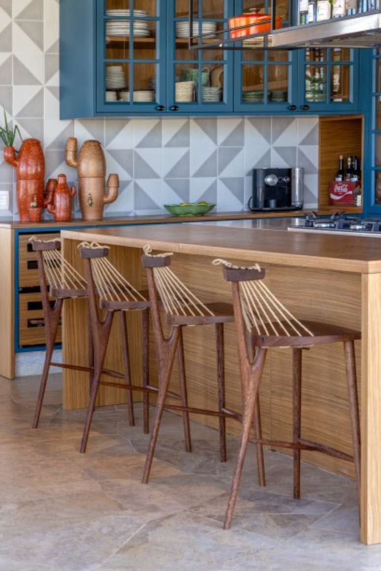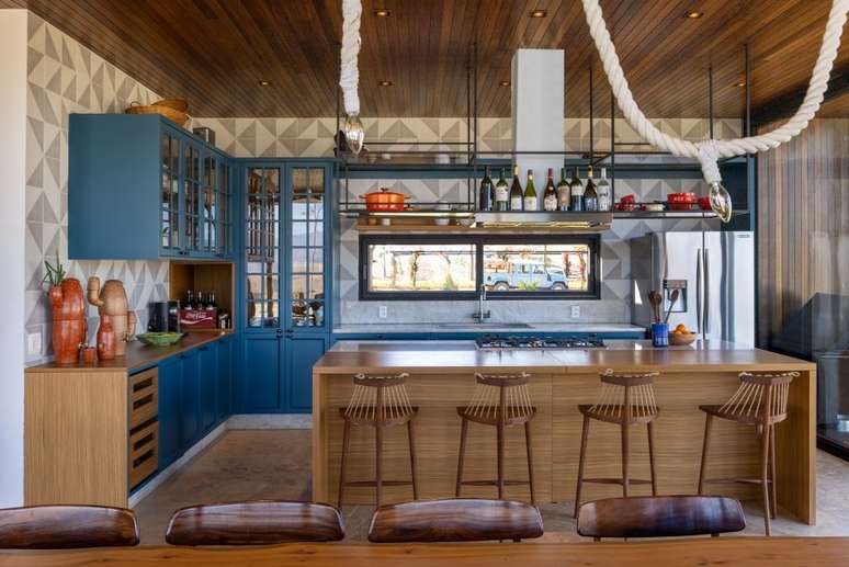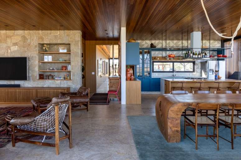 Como a casa é totalmente integrada à natureza, para amenizar a luminosidade durante o dia, a arquiteta escolheu cortinas de linho cru natural, que trouxeram aconchego ao living e à sala de jantar. Na cozinha, as cores aparecem no azul petróleo dos armários e nos azulejos cinzas.