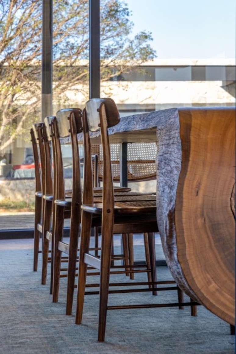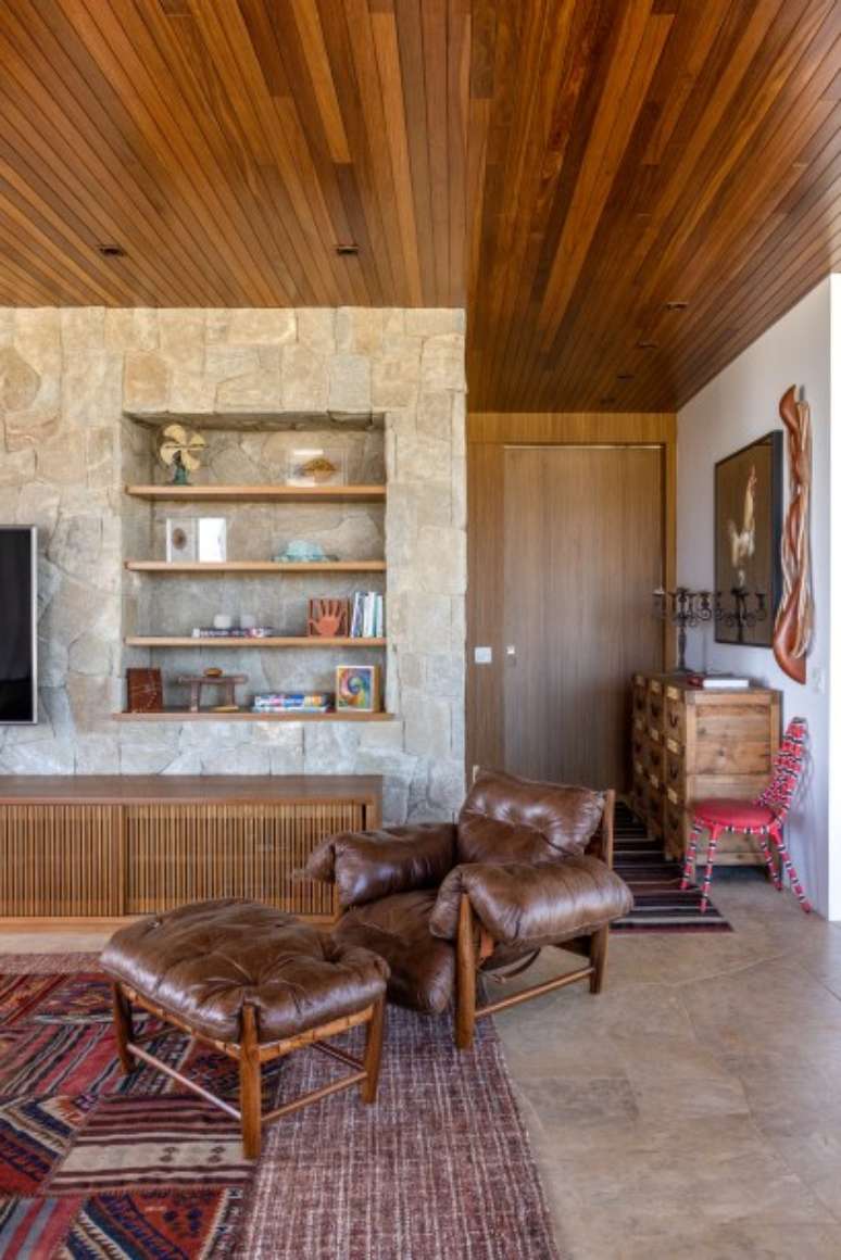 "Na sala de TV, coloquei um grande tapete em tons vermelhos para aquecer. Já no jantar, a mesa super rústica e as cadeiras assinadas por Sergio Rodrigues fazem o contraste de estilo e se integram com a arquitetura contemporânea do projeto", diz a Hana.