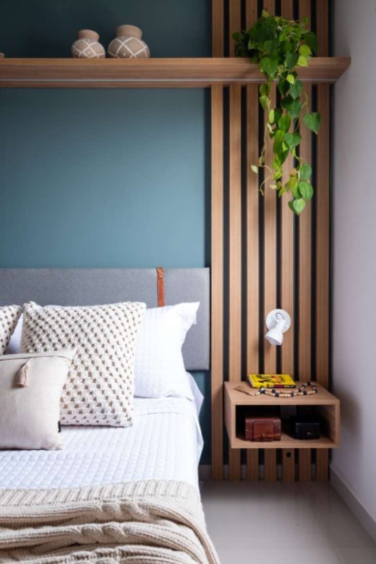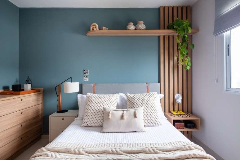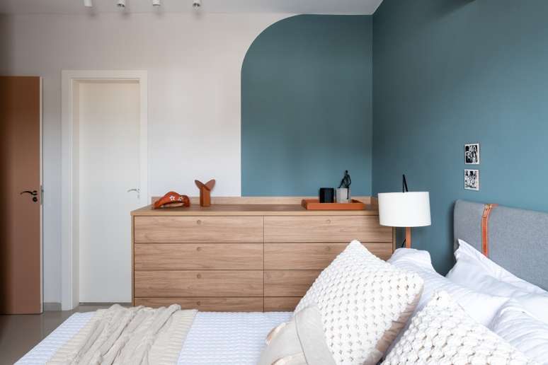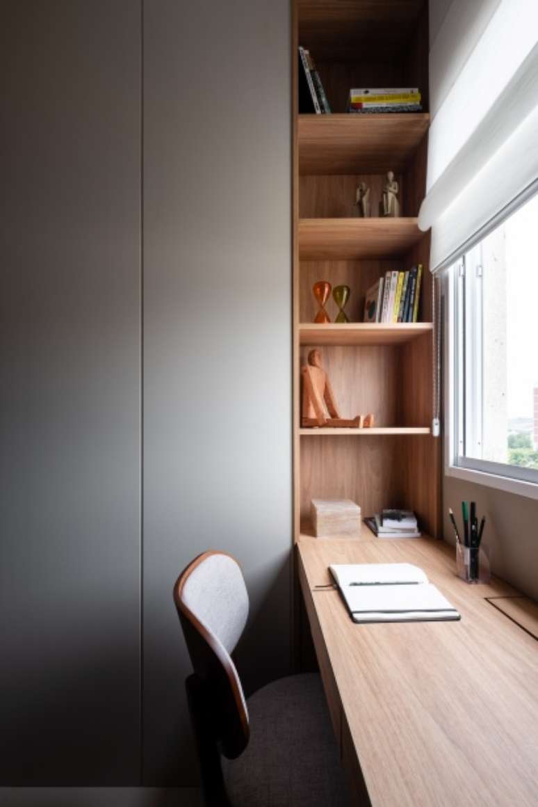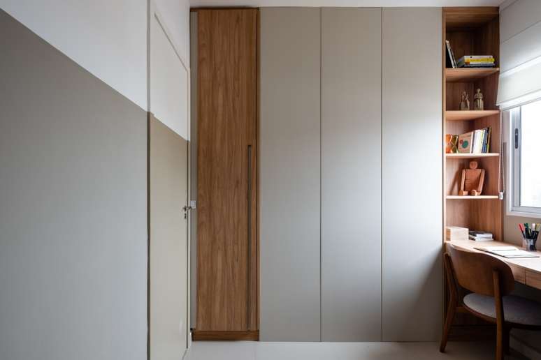 "Fizemos mais uma abertura com acesso a suíte e então dividimos esse ambiente com uma marcenaria, de um lado closet, e do outro painel e armário para o quarto de hóspedes/ home office", explica Thainá.