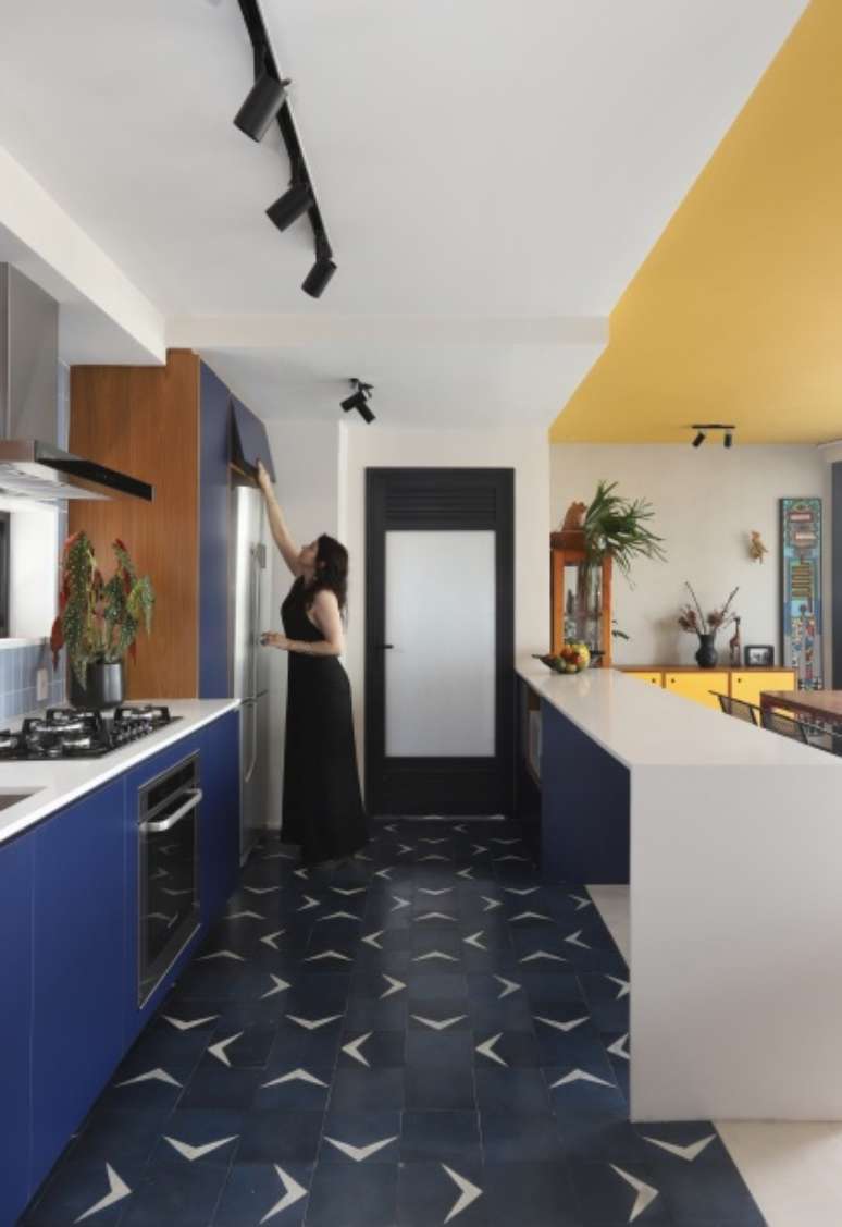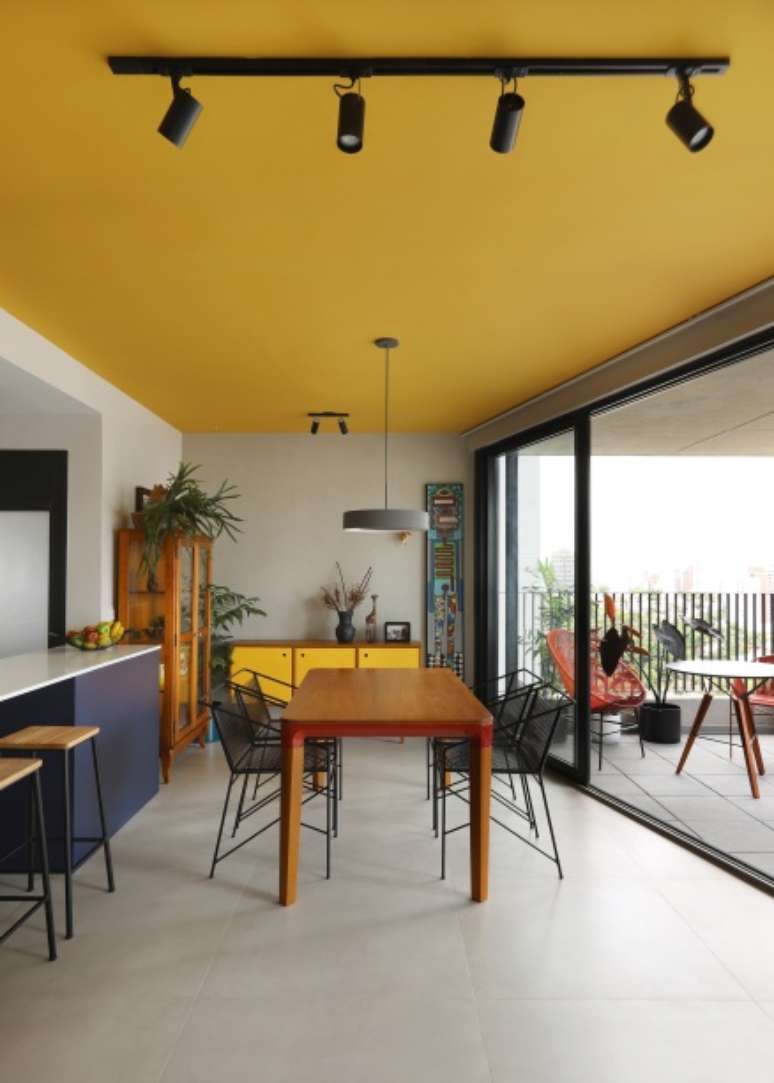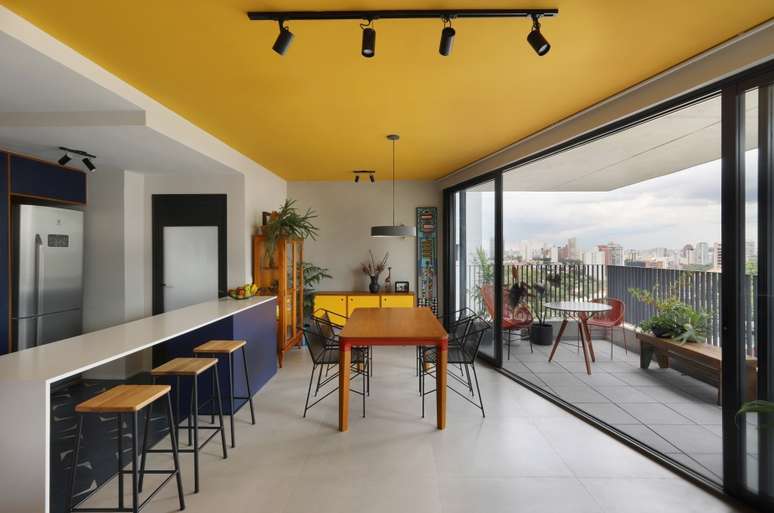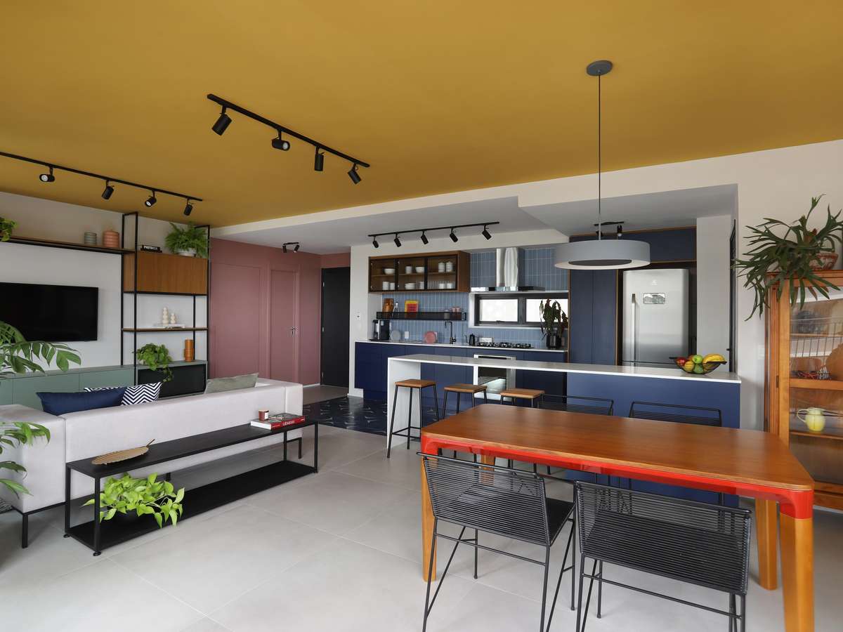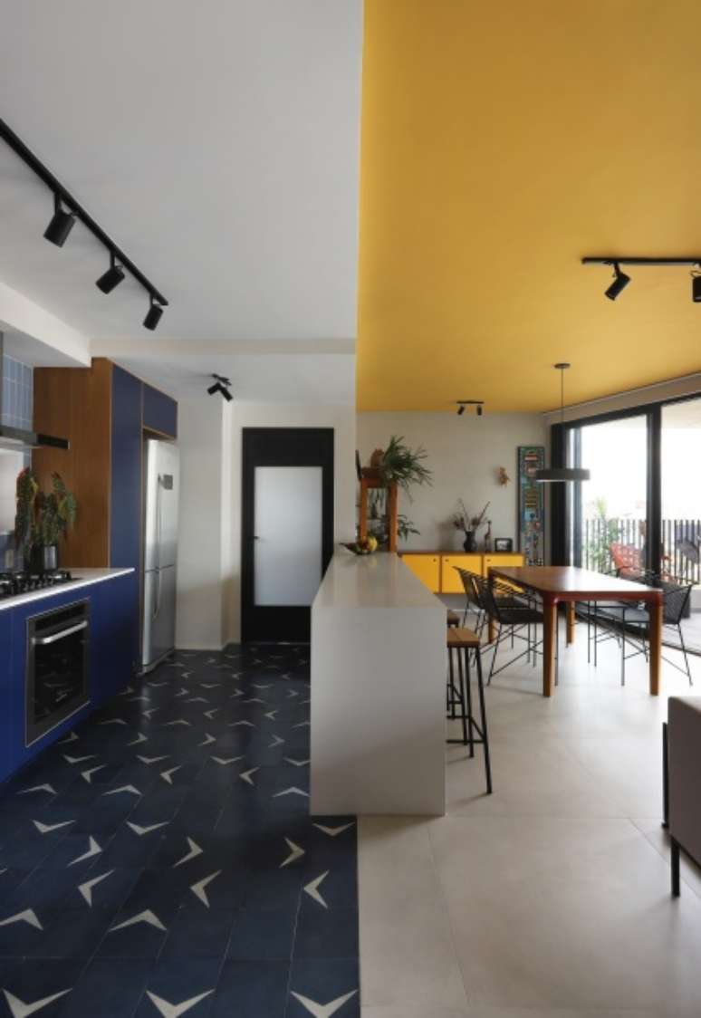 O teto recebeu um tom de mostarda, que em contraste com os tons de azul da cozinha, delimitam a área dos ambientes.