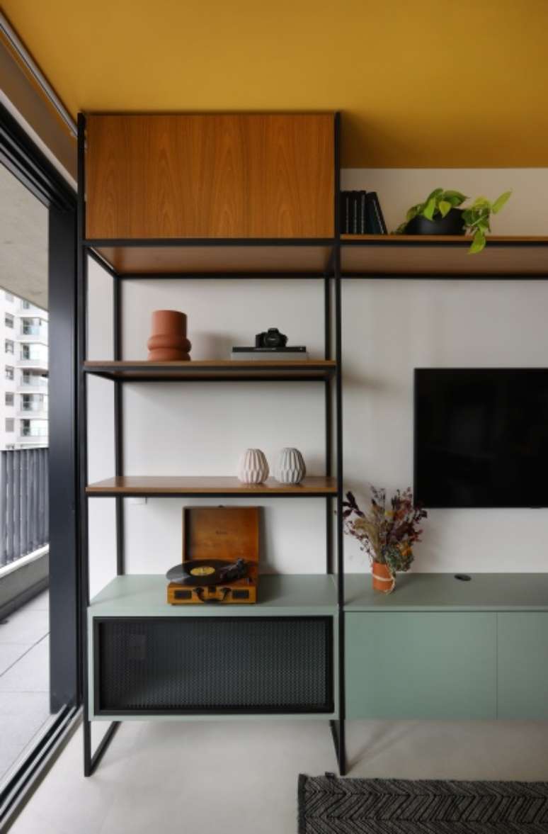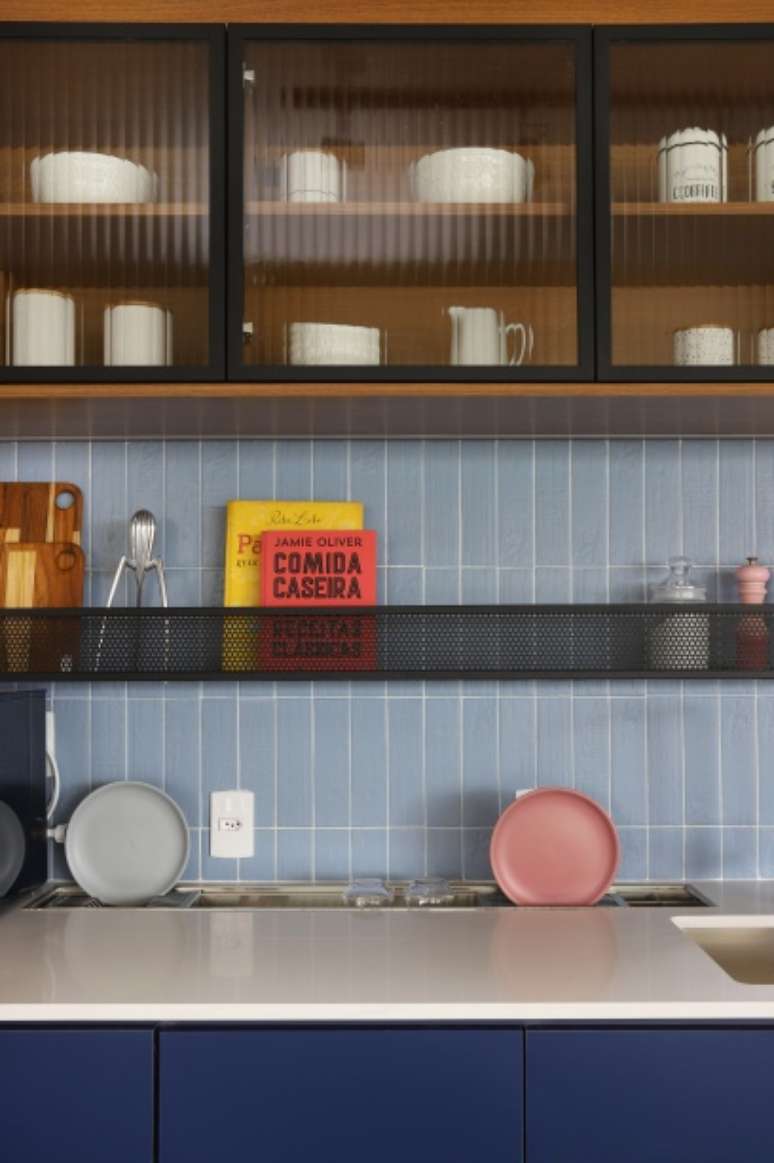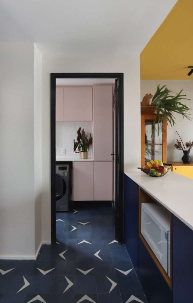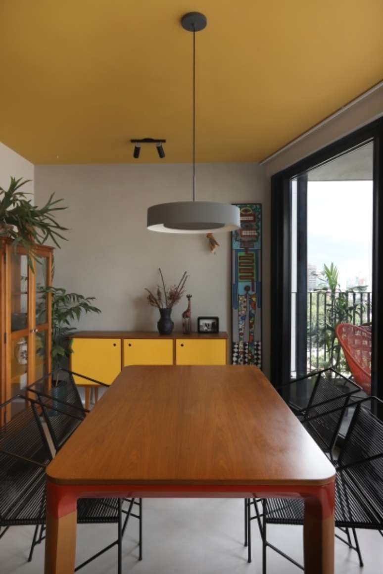 O teto recebeu um tom de mostarda, que em contraste com os tons de azul da cozinha, delimitam a área dos ambientes.