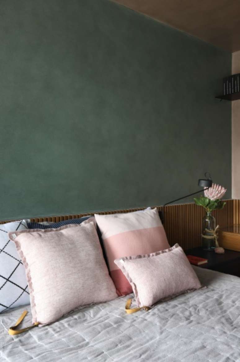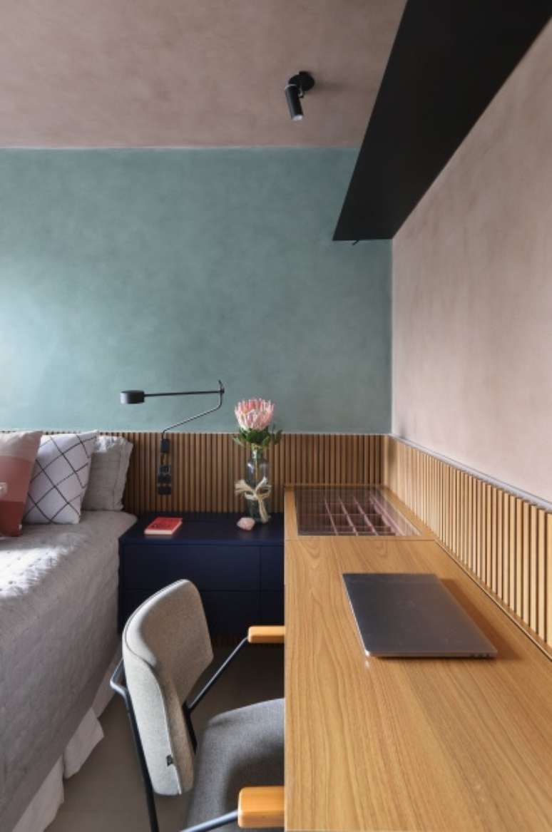 A suíte principal recebeu uma paleta de cores diversificada e muito interessante! As paredes receberam cimento queimado em tons verde, rosa e cinza e o mobiliário é composto por MDF freijó e fórmica na cor azul noturno.