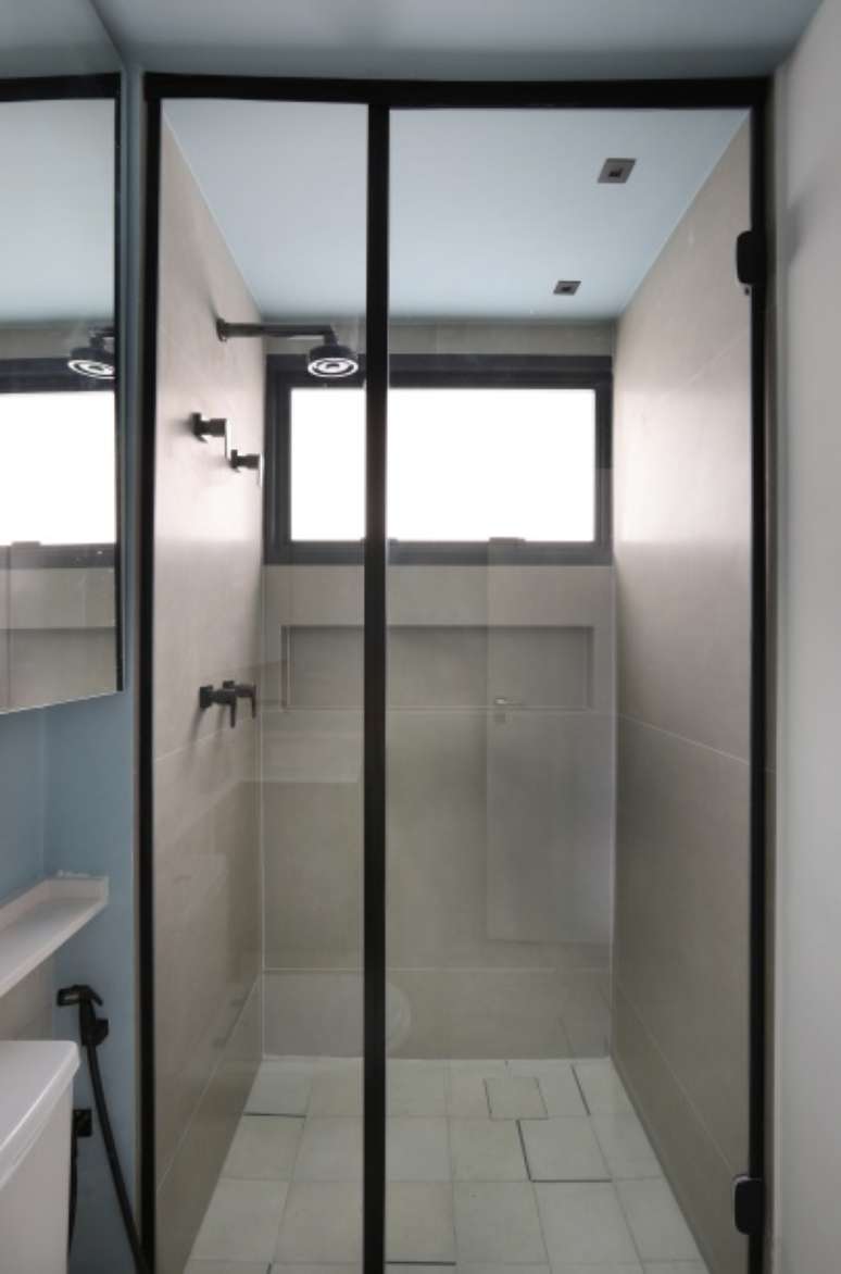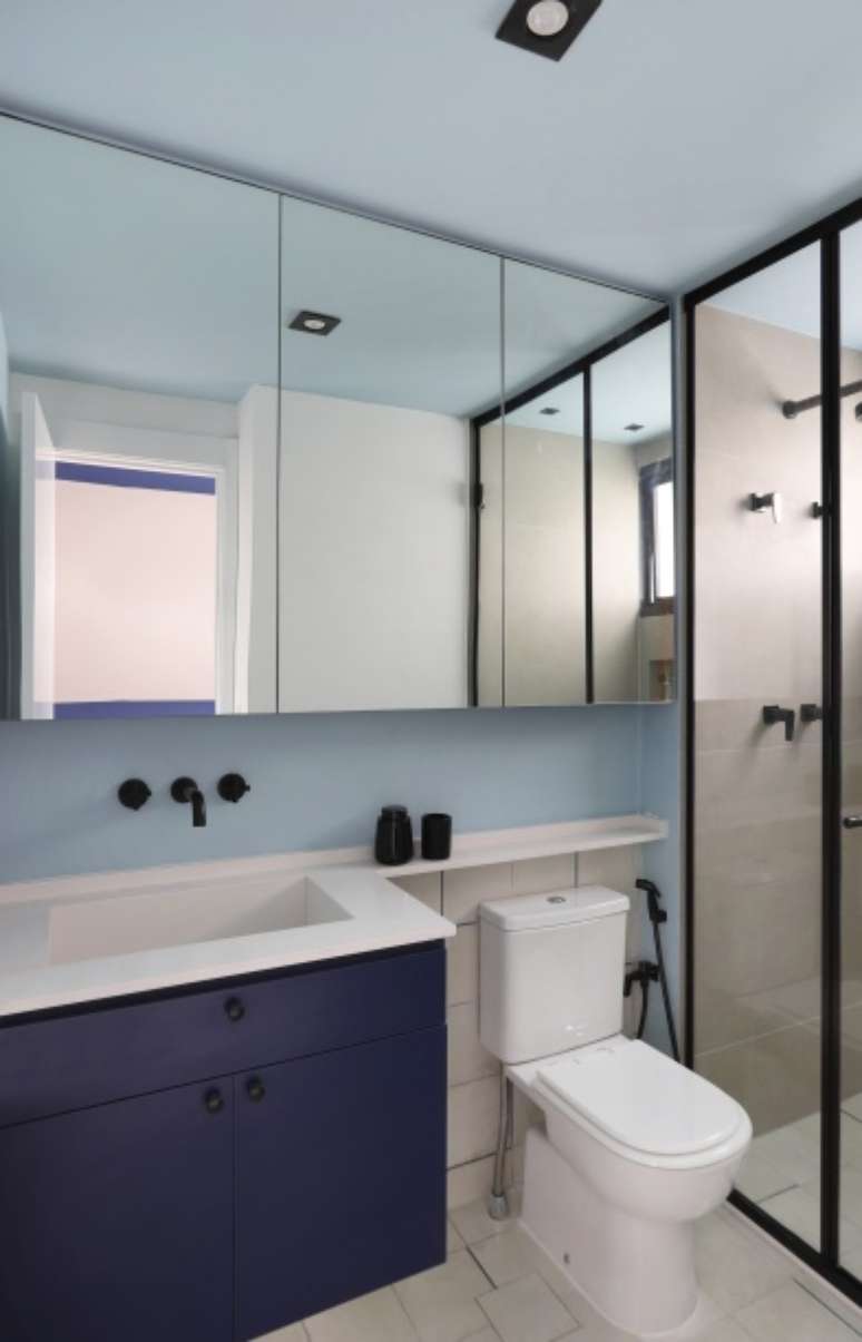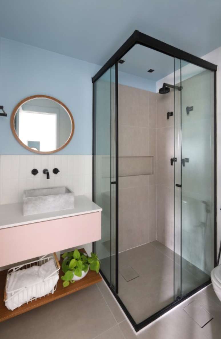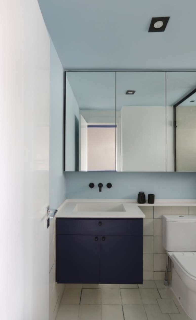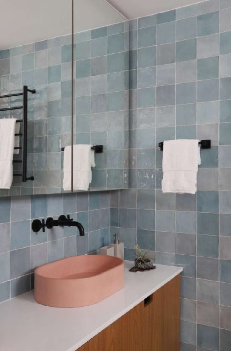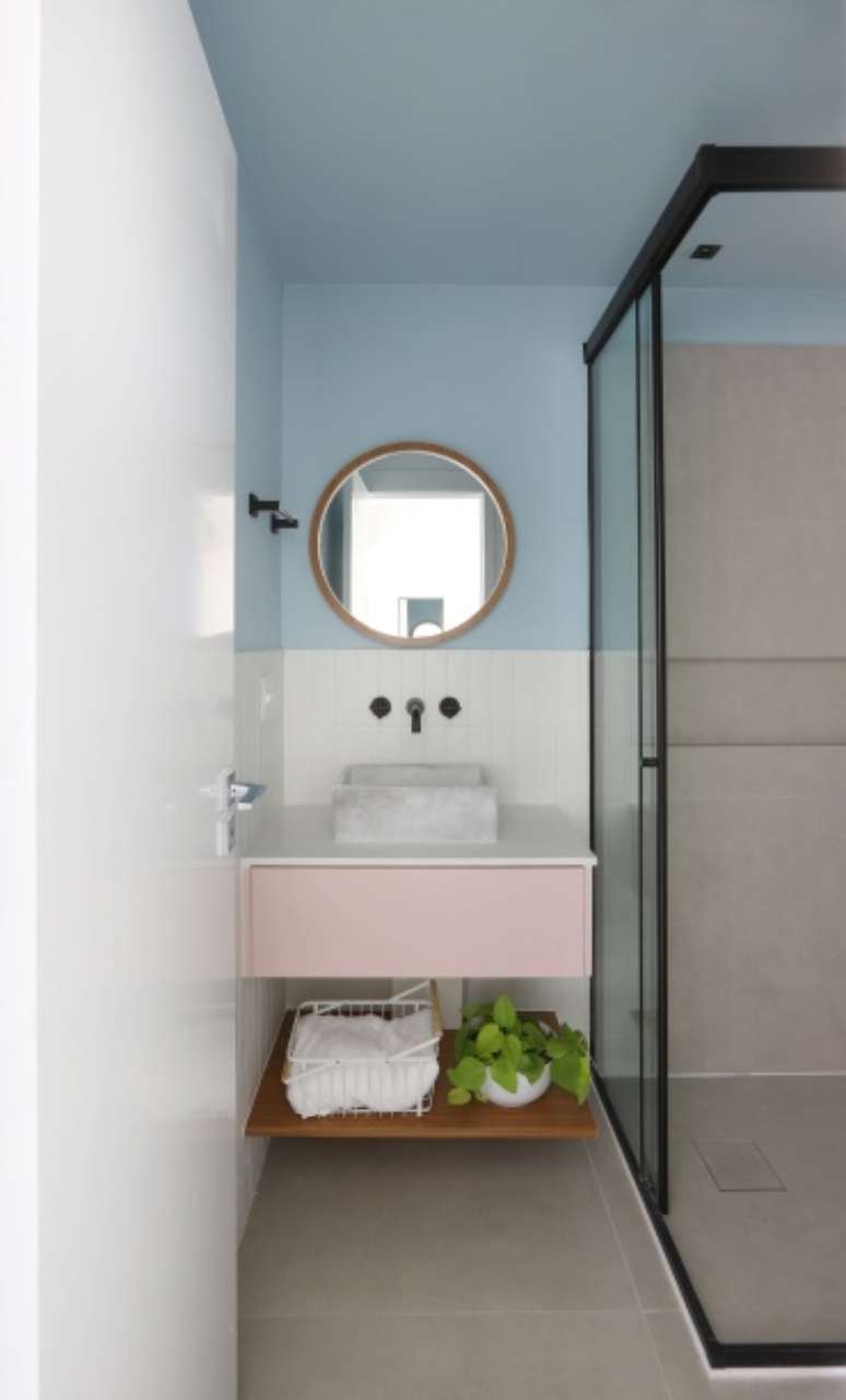 Seu banheiro recebeu ladrilho hidráulico no piso em meia parede, armário superior em marcenaria para ganhar espaço de armazenamento e pintura em tom de azul nas paredes e no teto.