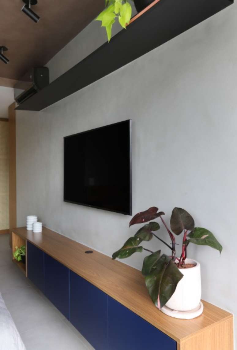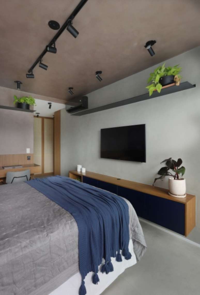 O teto recebeu cimento queimado em tom de rosa. Para o mobiliário, foi projetado um aparador em marcenaria e prateleira em serralheria para dar suporte a itens de decoração e livros. Ao lado da cama, mesas laterais em fórmica azul noturno com régua de tomadas embutidas, cabeceira em MDF freijó ripada com LED.