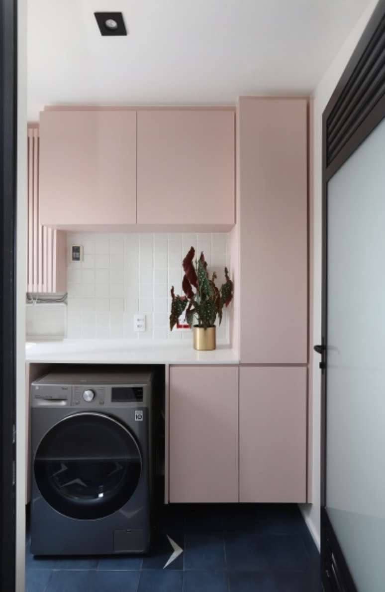 O lavabo também recebeu um tom de rosa no piso de ladrilhos, paredes, porta e teto e os pontos de cor aparecem no gabinete em fórmica verde pastel e na cuba de concreto.