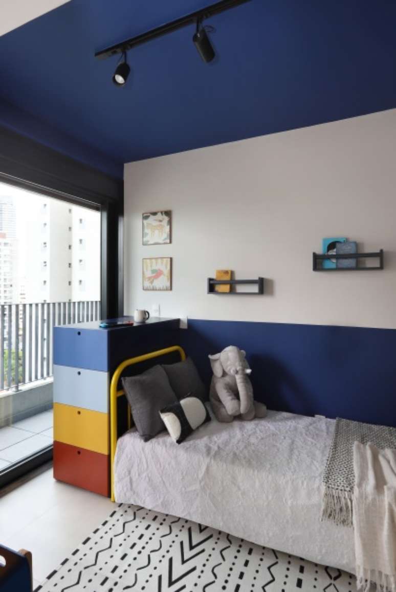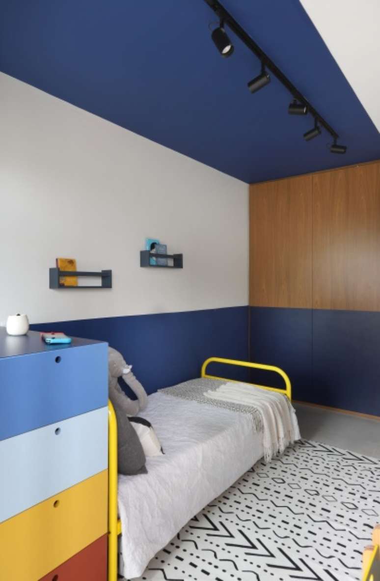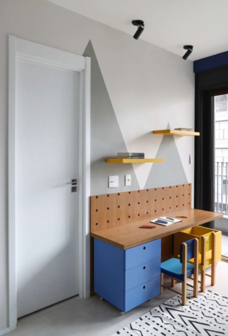 A suíte do filho, recebeu pintura azul em meia parede e em trecho de teto, e as cores ficaram por conta do gaveteiro em marcenaria, armários, cama e objetos de decoração. A mesa tipo peg-board foi projetada para ter altura adaptável conforme o crescimento do filho.