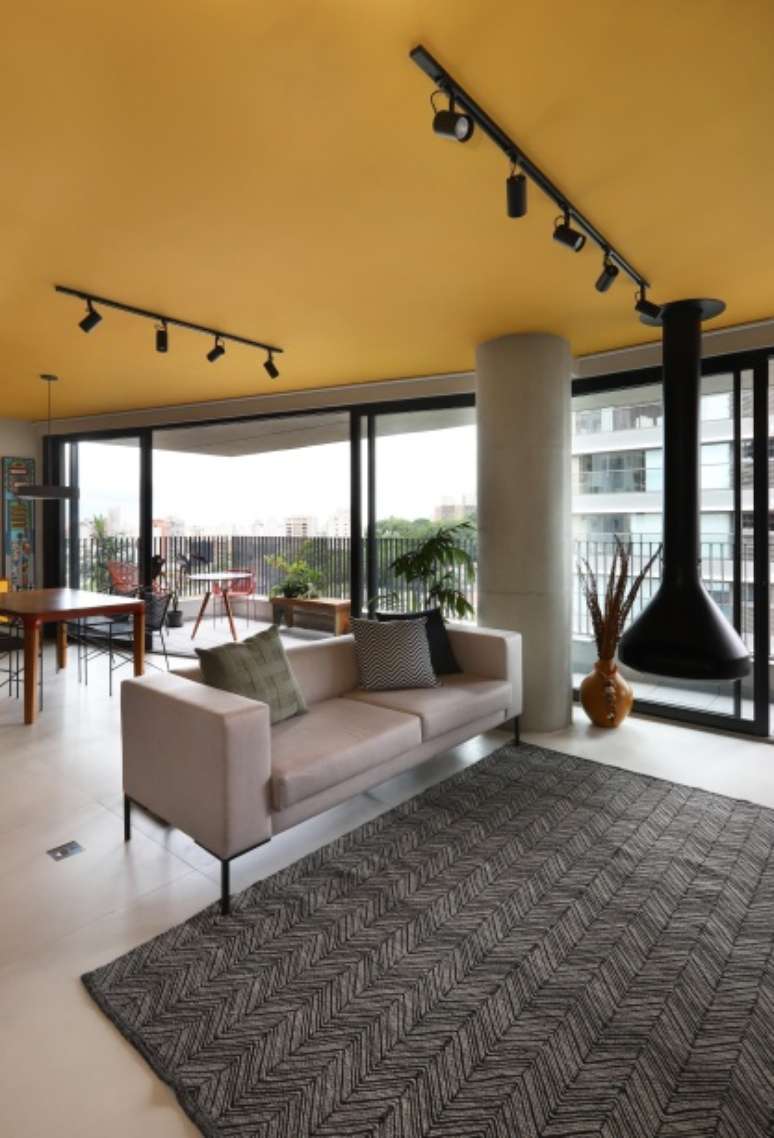 O pilar circular existente na sala é um dos protagonistas do apartamento. Ao lado, foi instalada uma lareira ecológica suspensa e ao fundo, portas de vidro que permeiam toda a sala, permitindo o acesso à varanda.