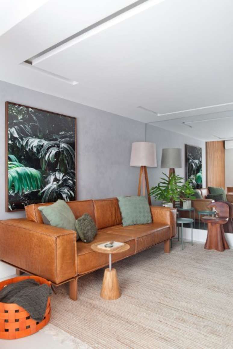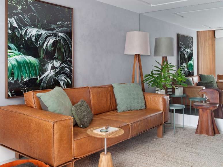 O projeto segue o estilo contemporâneo, sem excessos de adornos. A decoração da sala tem uma base neutra e clara, em tons de cinza, com toques de verde oliva, com predomínio de materiais naturais, como couro caramelo, madeira e fibra.