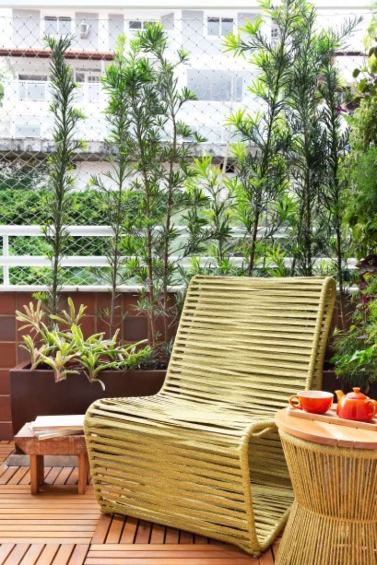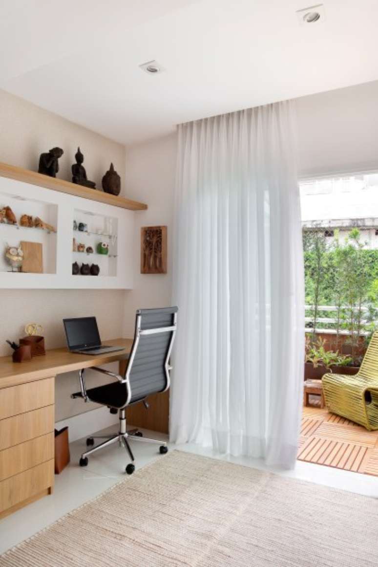 Já no escritório, além da bancada, o papel de parede, o tapete e a cortina de linho branco também são novos. "Aqui, o único ponto de cor está na varanda, ambientada com um poltrona e uma mesa de apoio de corda náutica amarela, da Tidelli", finaliza Livia Amendola.