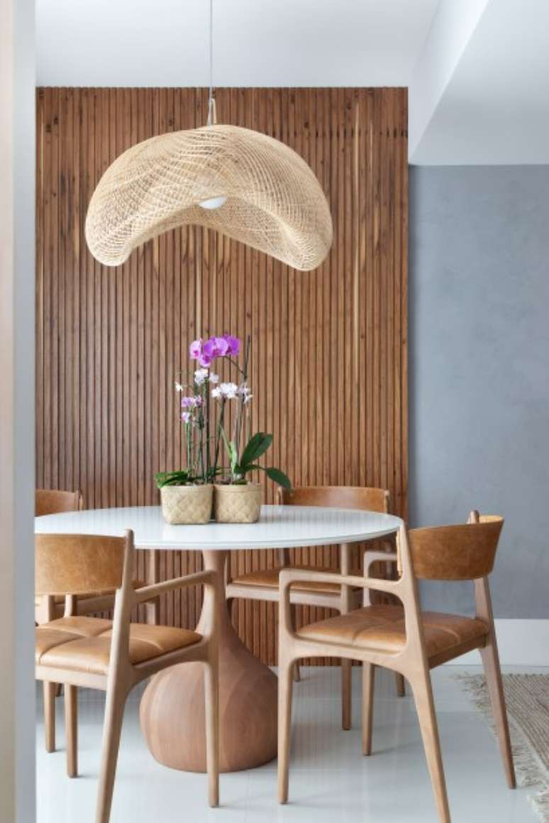 "No ambiente de estar, usamos tapete de sisal com algodão e, na área de jantar, uma luminária pendente com formato orgânico e cúpula de rattan", exemplifica Rômulo. Todas as peças são novas, entre adornos, acessórios, móveis e quadros, com destaque para as cadeiras Helga, a mesa de jantar Baloon e o sofá Lessa, todos assinados pelo Estudiobola e fornecidos pelo LZ Studio.