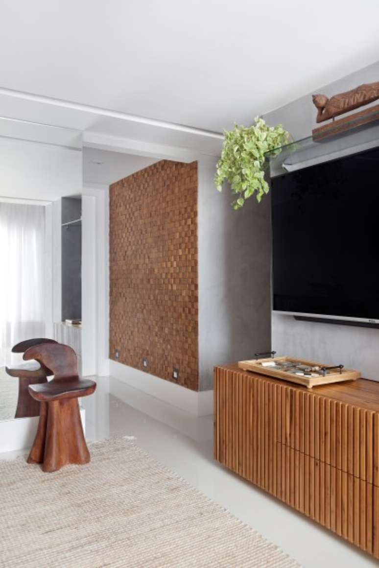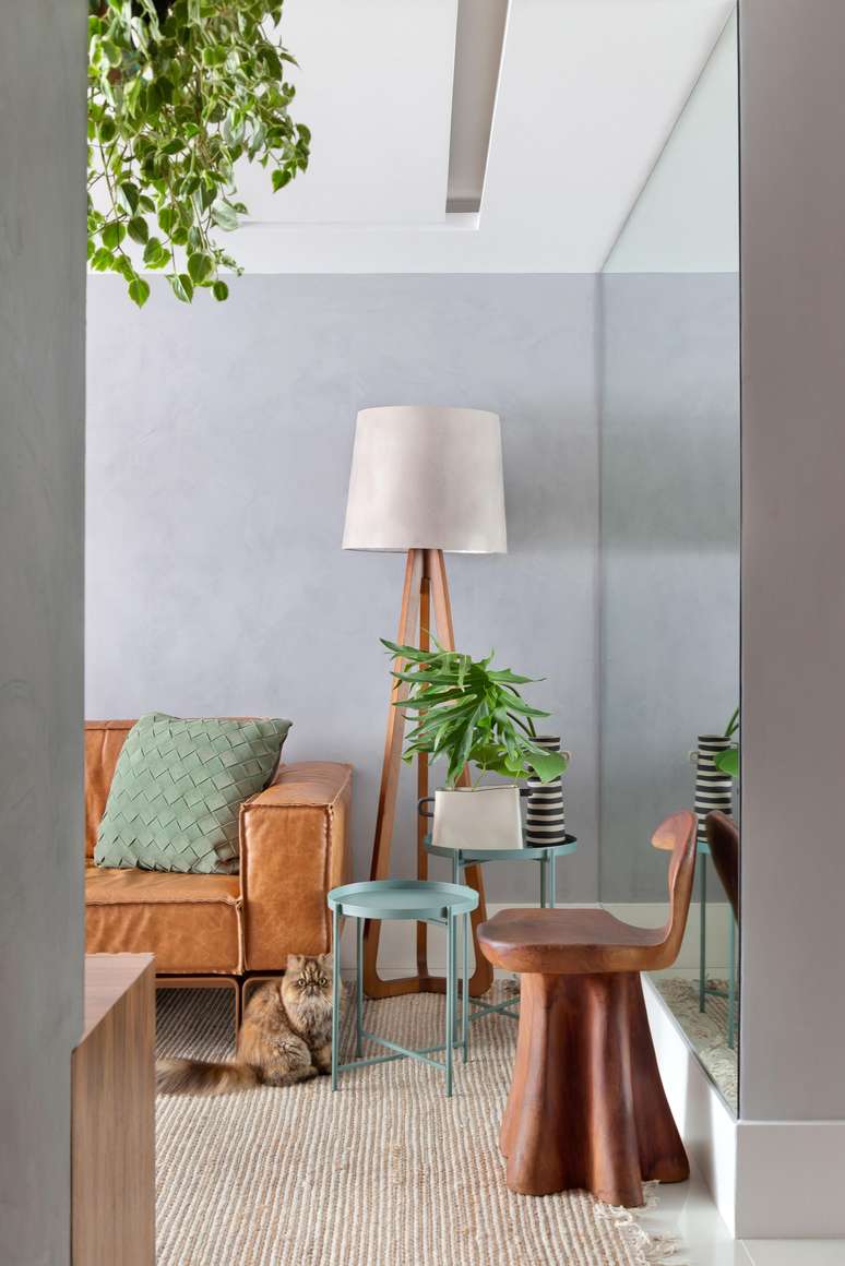 Couro, madeira e fibra compõem décor contemporâneo de cobertura de 130 m²
