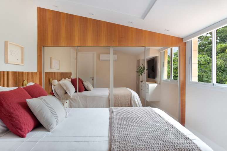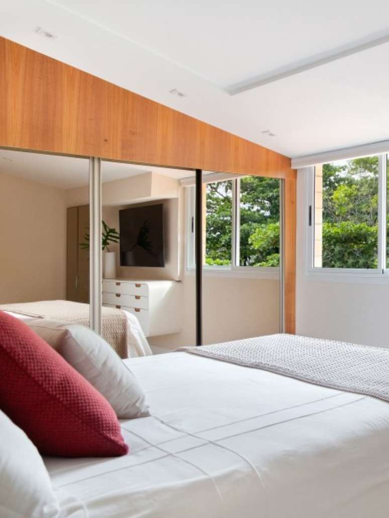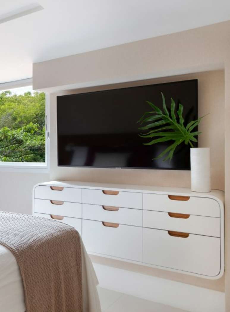 Na suíte principal também é tudo novo, inclusive a marcenaria, integralmente desenhada pelo escritório, a exemplo do rack abaixo da tv, com quinas arredondadas, acabamento em laca branca acetinada e gavetas com puxadores amadeirados em cava.