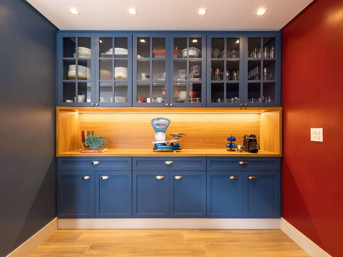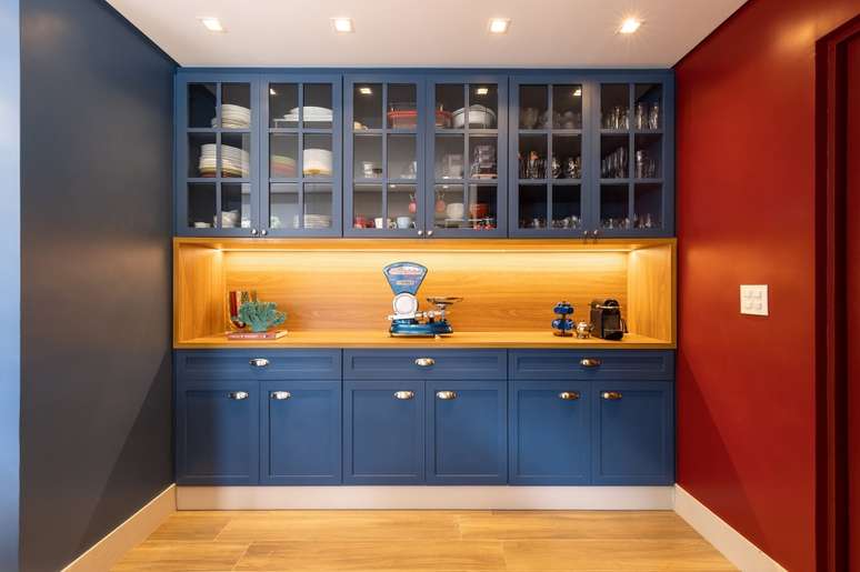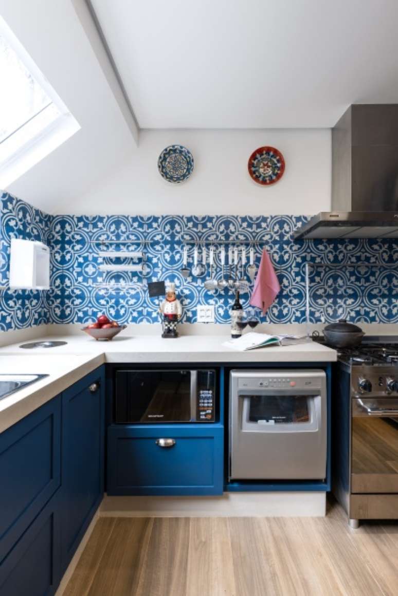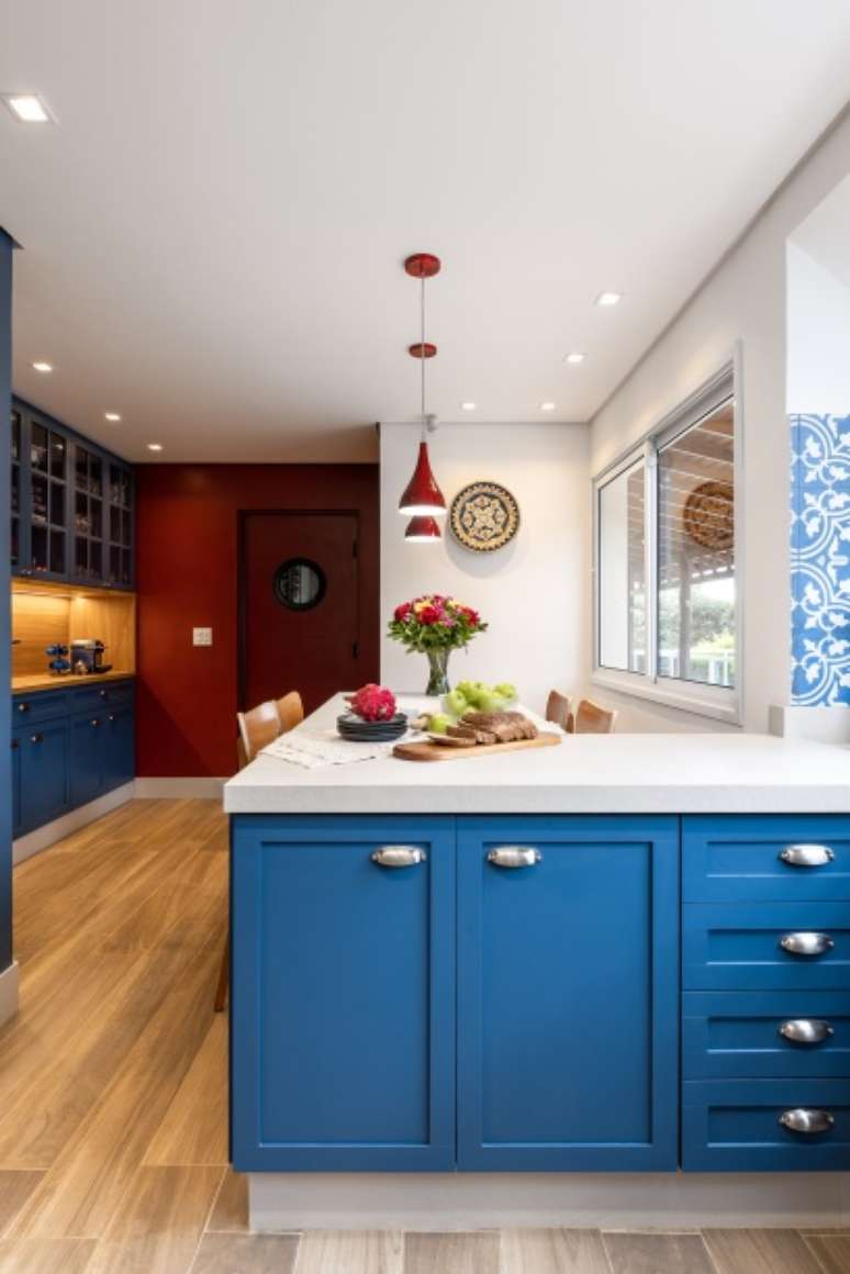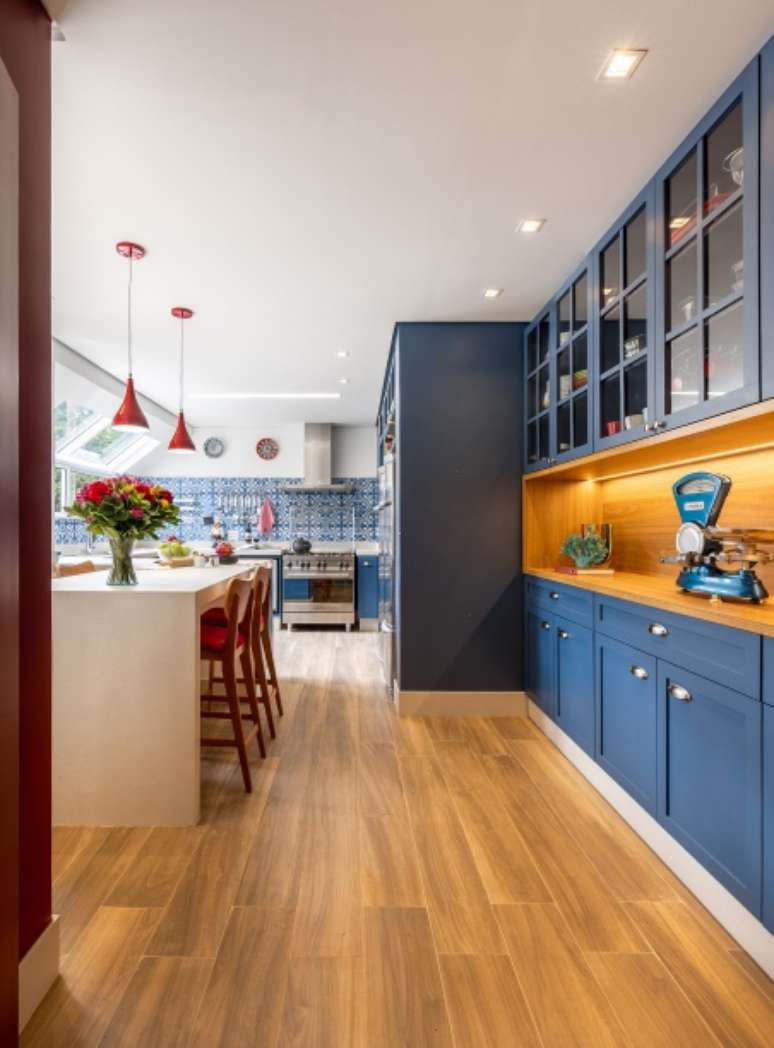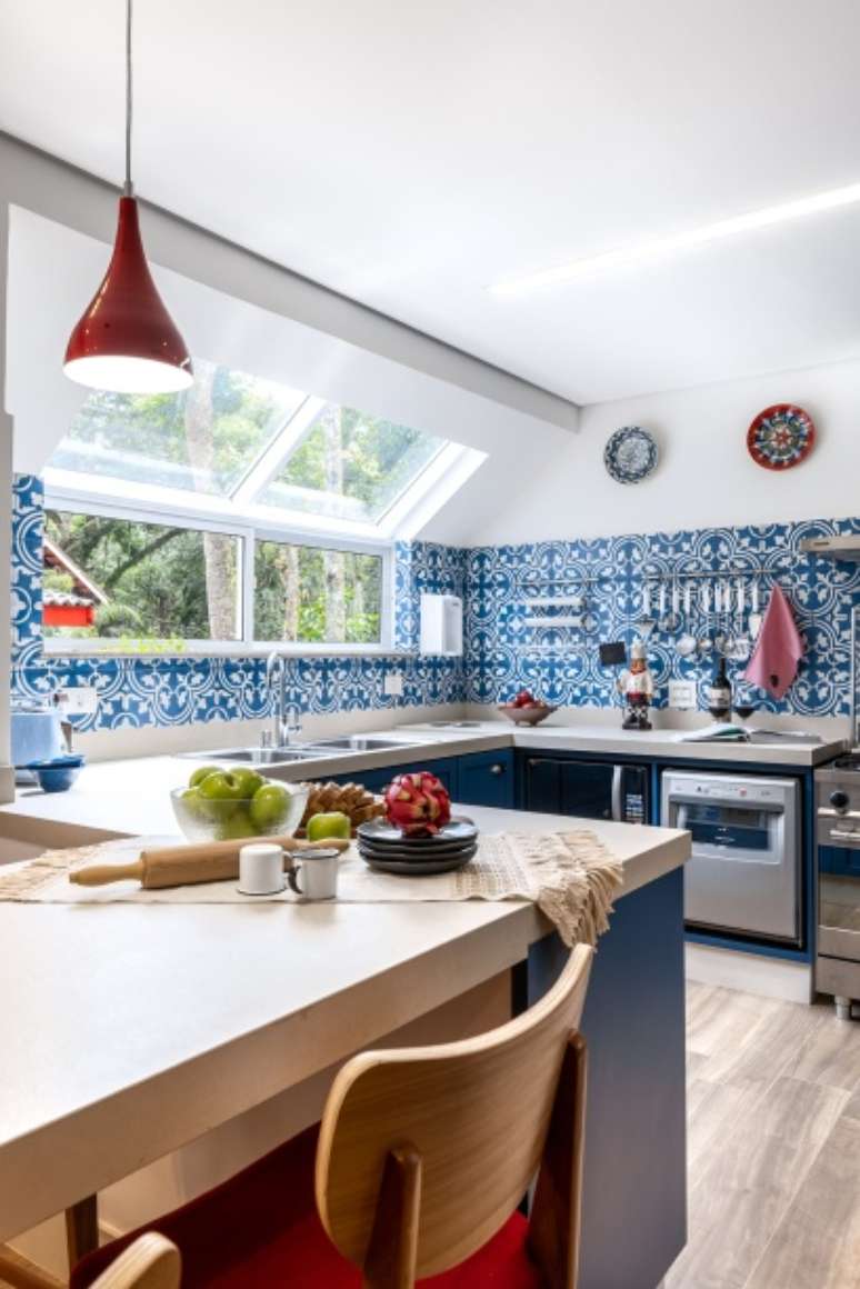 Cozinha com vista para natureza ganha marcenaria azul e claraboia