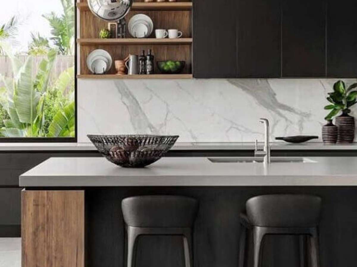 Um dos revestimentos mais usados para decoração de cozinha de luxo é o mármore, no entanto, há outras opções como tipos de porcelanato, madeira, paredes rústicas com pedra ou até mesmo o silestone para a bancada do armário de cozinha de luxo moderna.
