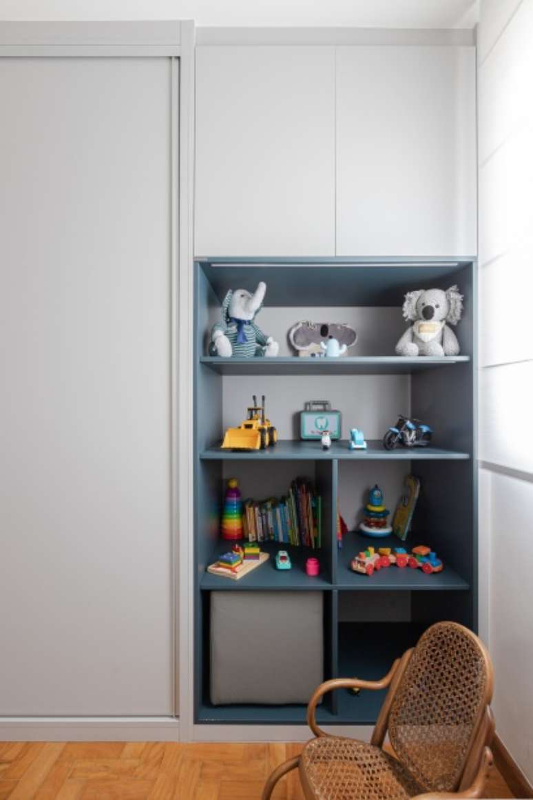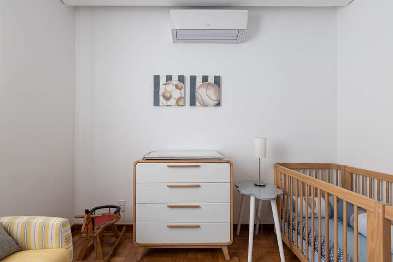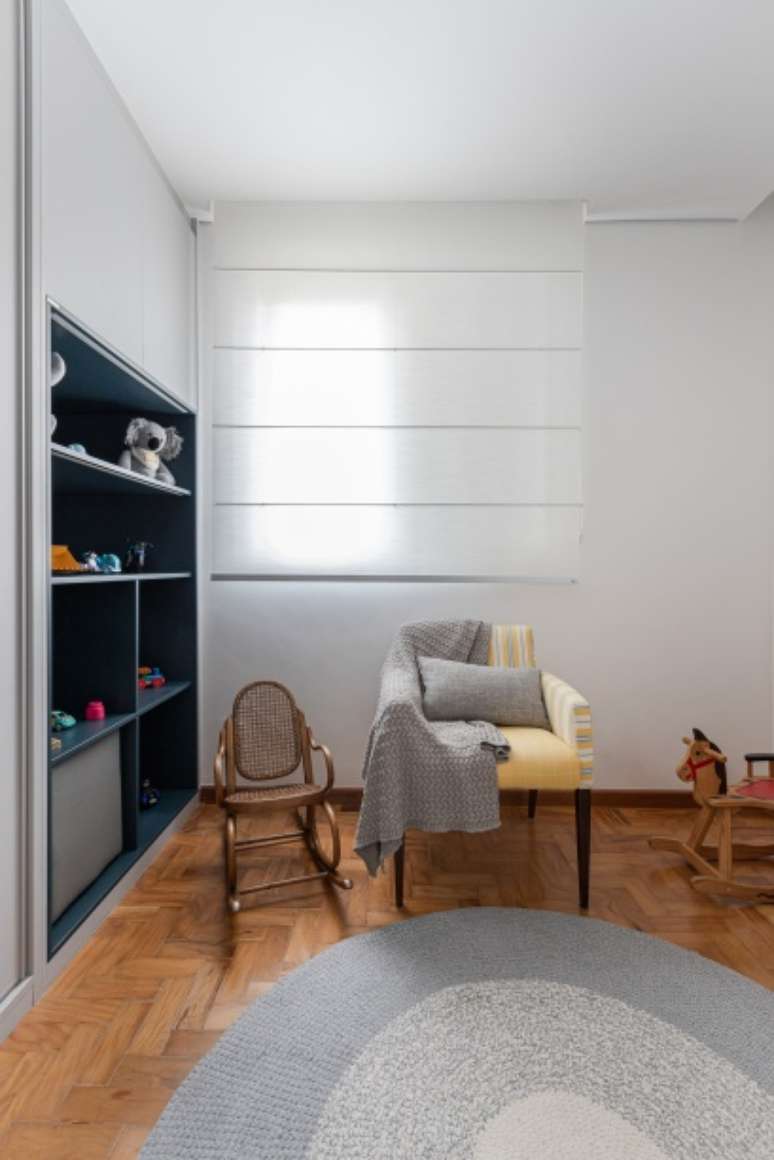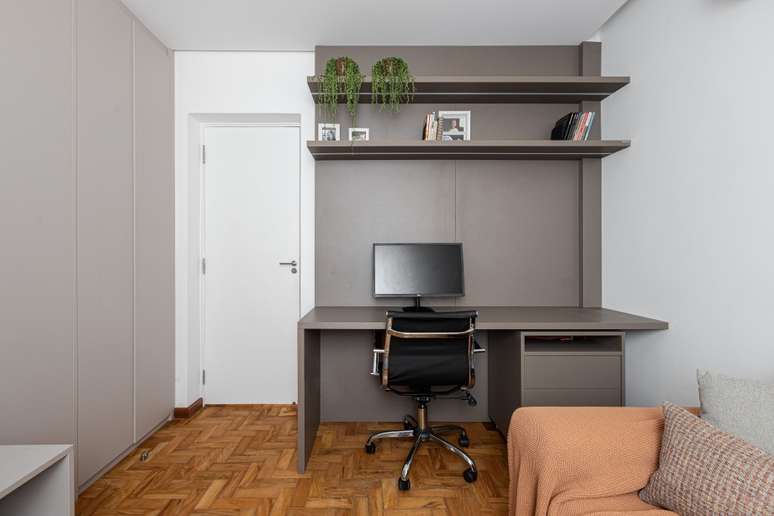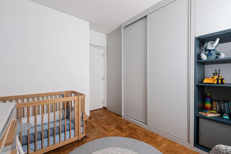 O mesmo princípio foi utilizado na separação do escritório com o quarto de bebê: a parede que separava esses dois ambientes foi demolida e, em seu lugar, foi feito um grande armário para dividir os cômodos. Assim, parte do móvel atende o escritório e a outra parte atende o quarto de bebê.