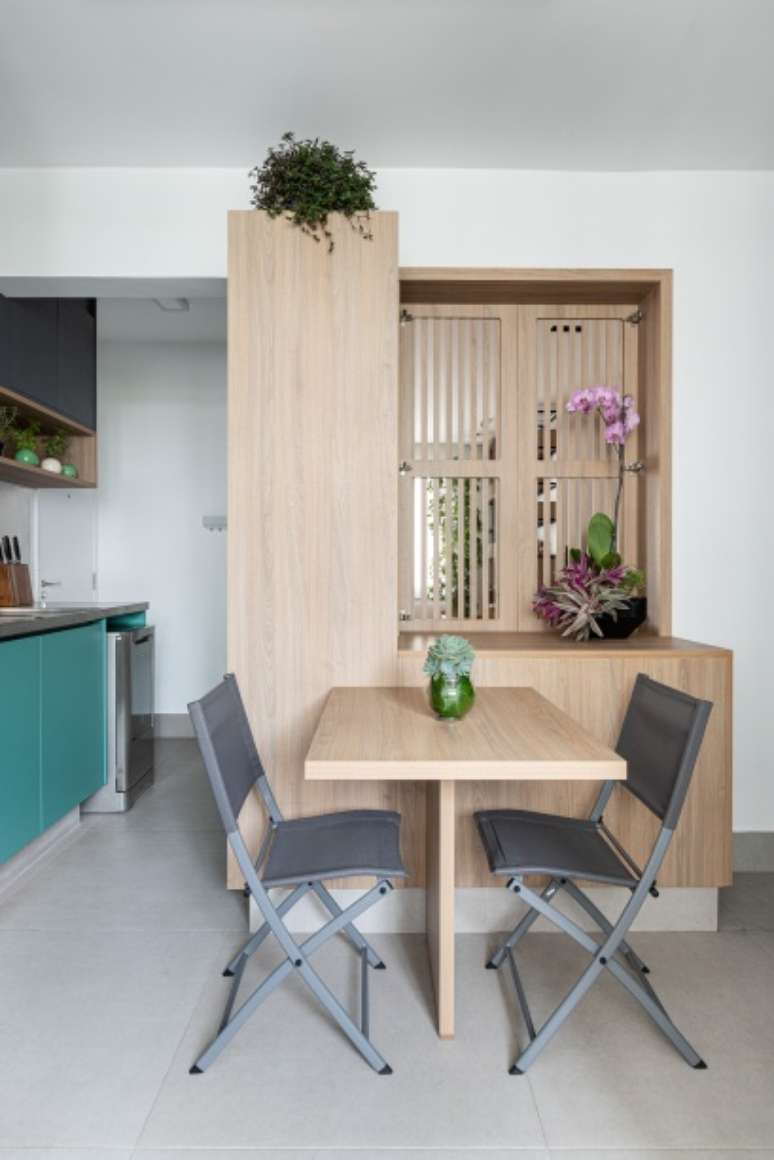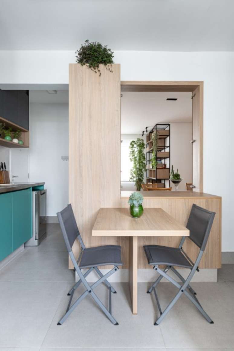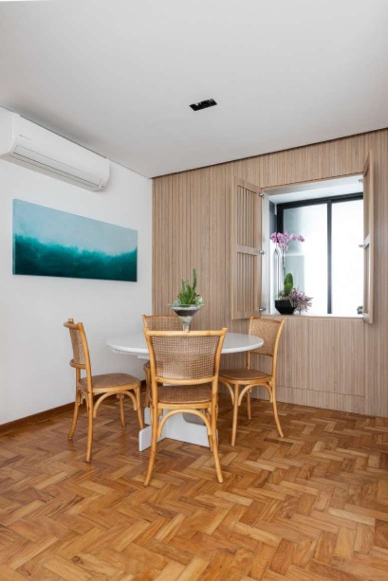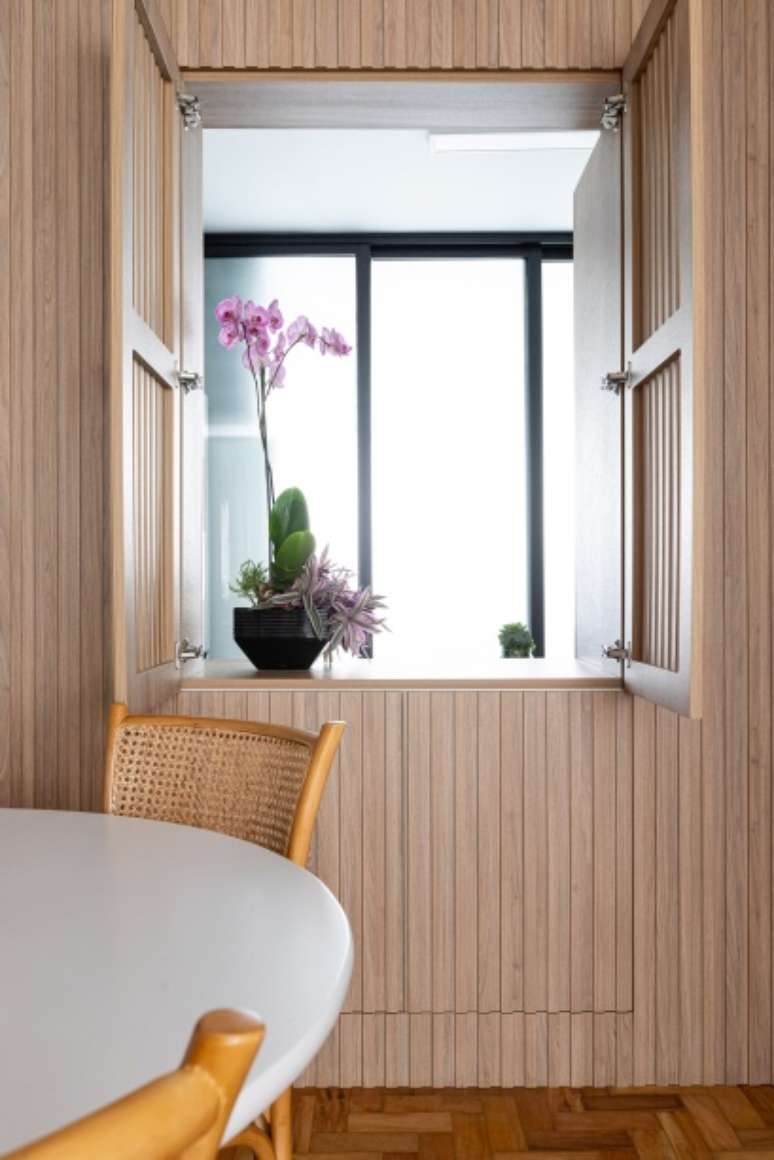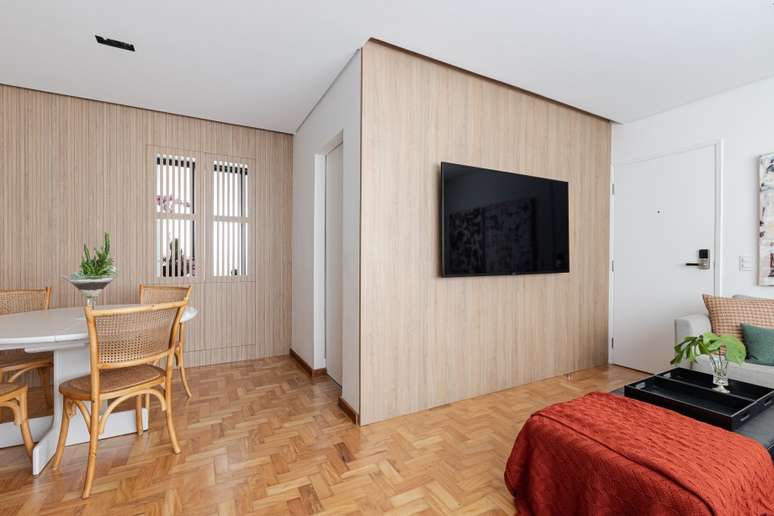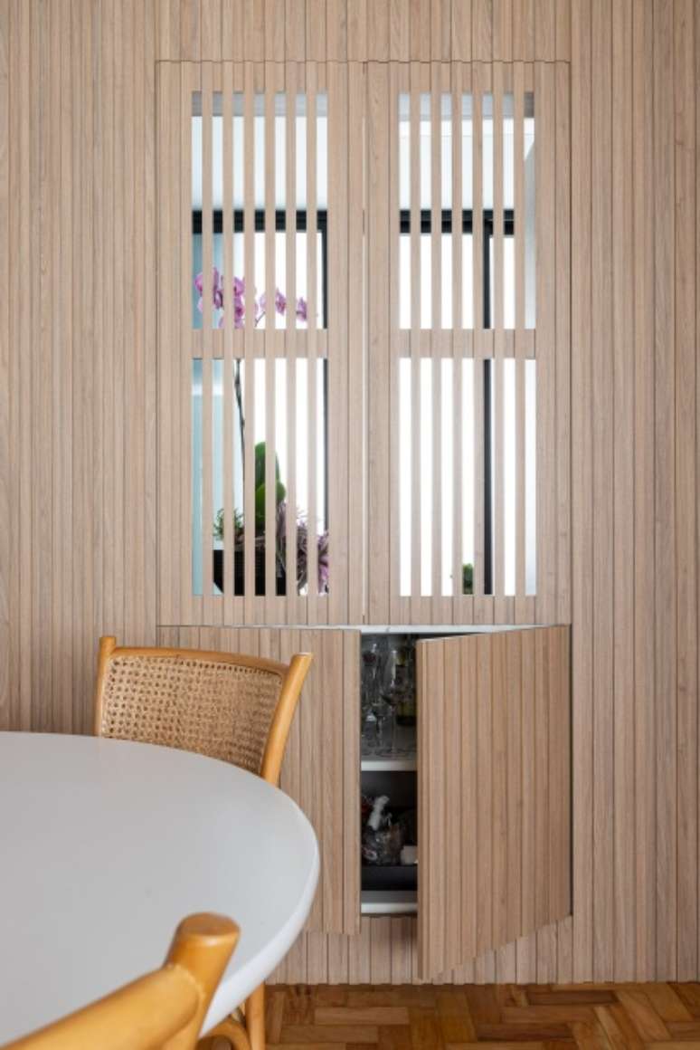 "Demolimos também parte da parede que separava a sala da cozinha para integrar esses ambientes através de um passa prato. Essa ligação foi feita com um painel de marcenaria ripada. As ripas vazadas são como uma 'janela' para a cozinha e, quando fechadas, também permitem a passagem de luz", dizem. Logo abaixo dessa abertura, um móvel esconde o bar.
