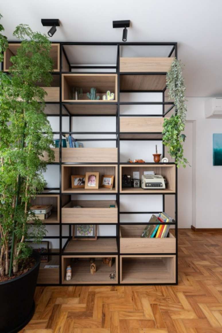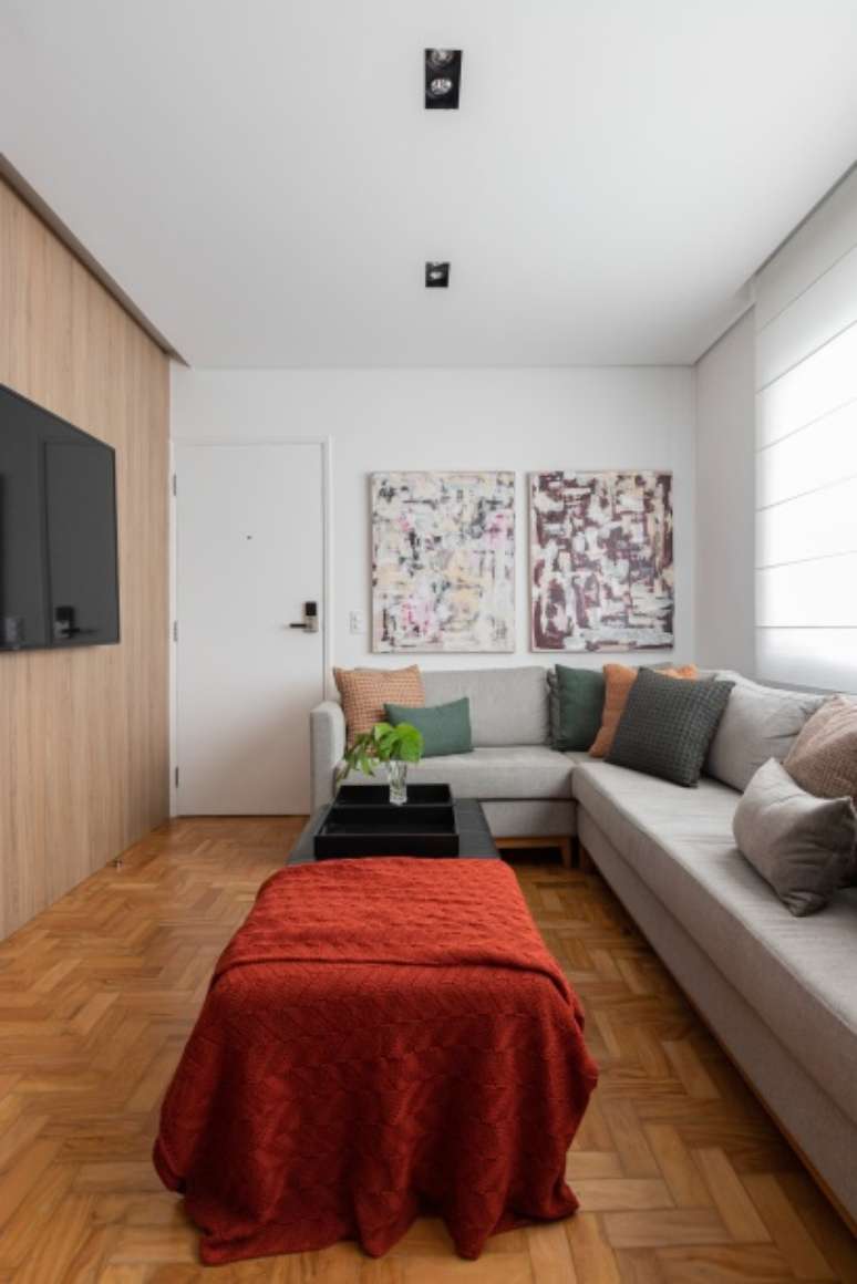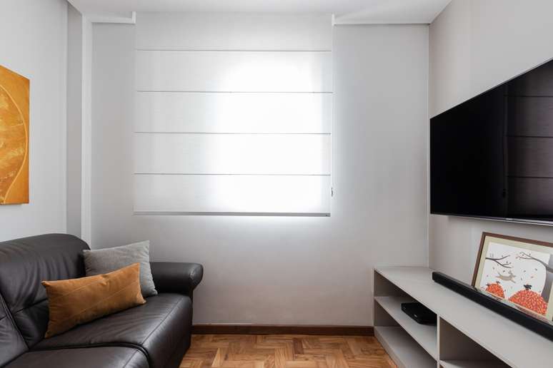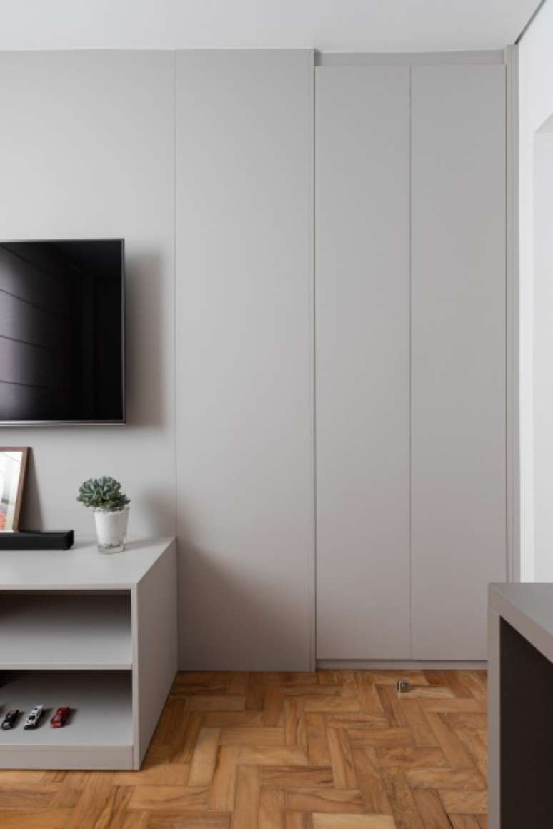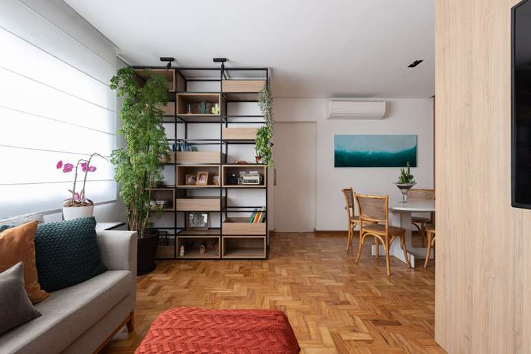 O imóvel com mais de 40 anos precisava de uma reforma completa: a única coisa que o escritório manteve foi o taquinho de madeira que é o original do apartamento. De resto, a marcenaria planejada otimizou os espaços para criar armários e espaços de armazenamento.