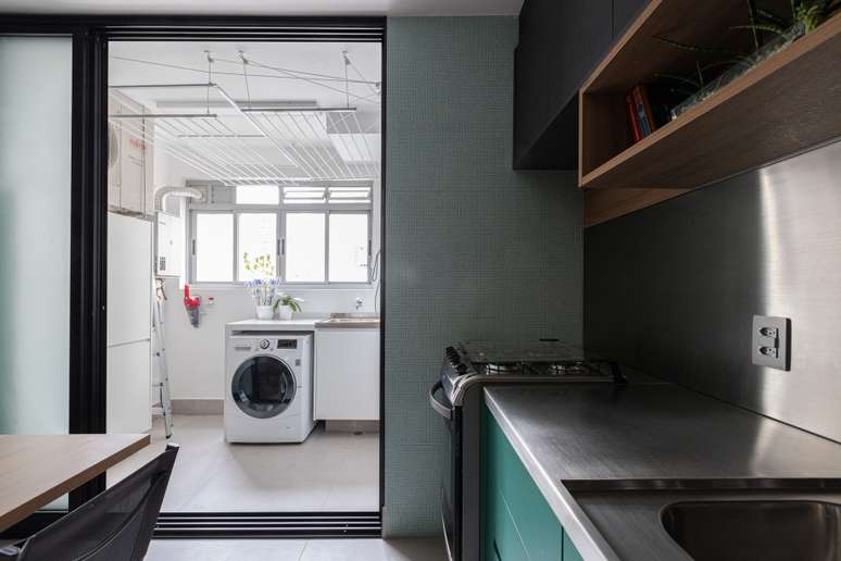 Cozinha mescla inox e marcenaria verde neste apartamento de 95 m²