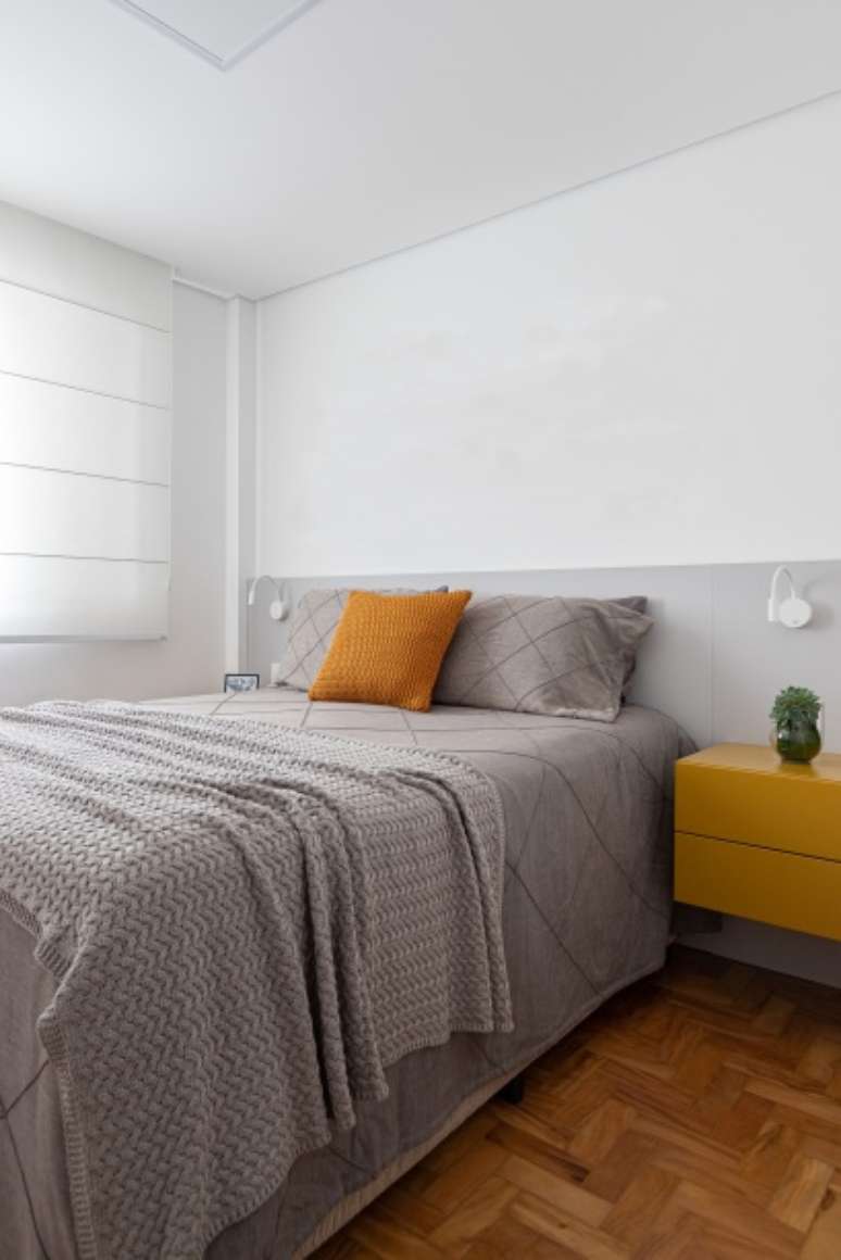 No quarto do casal, a cliente solicitou uma cama queen, por isso não caberia mais armários dentro do dormitório. A solução foi derrubar a parede divisória com a cozinha e colocar um armário como separação dos ambientes: uma parte do móvel atende o quarto e outra tem abertura para a cozinha.