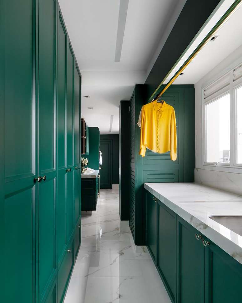 A cor eleita para complementar o ambiente com estilo predominante europeu com linguagem contemporânea foi o verde Deep Garden da Florense. No projeto esse tom de verde foi incorporado em armários de madeira com molduras em portas e gavetas.