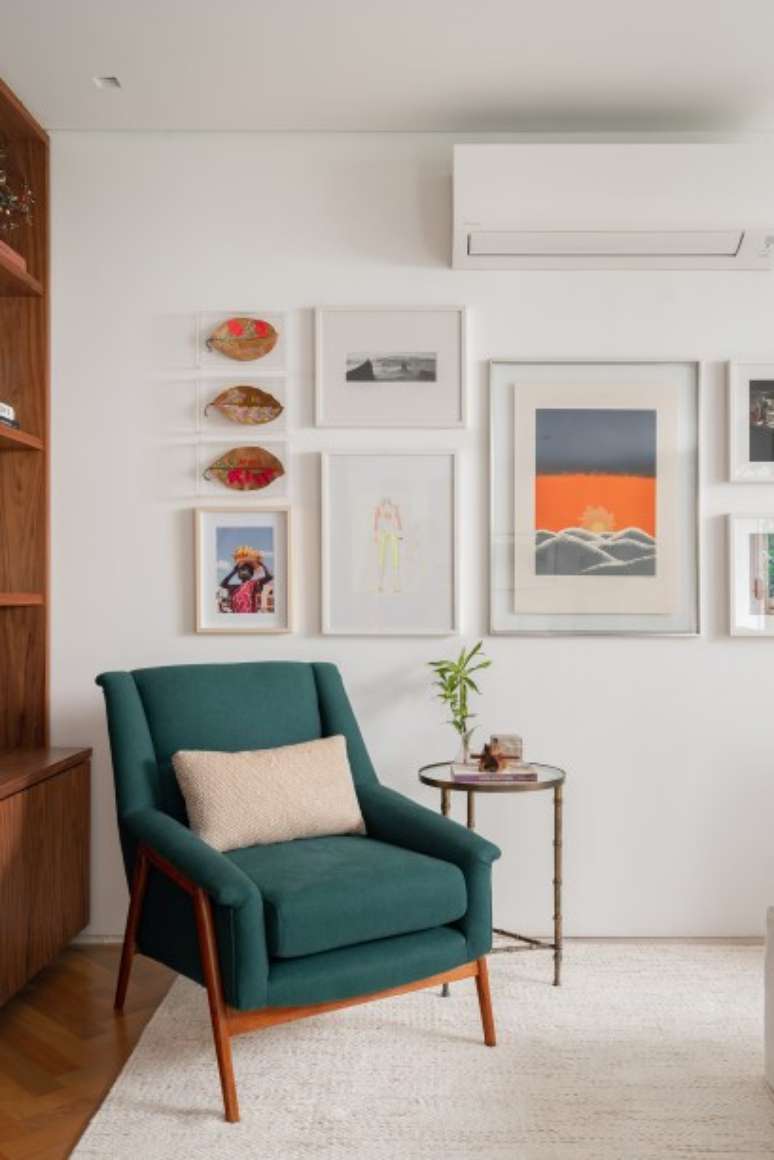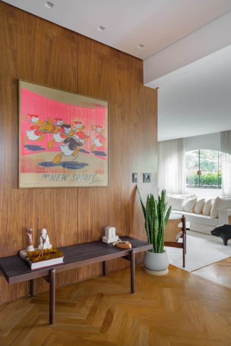 "Já fazia parte do acervo a mesa de jantar toda de mármore branco que era da avó da cliente e a poltrona kilin do Sergio Rodrigues. O carrinho de bar - um móvel de jacarandá da década de 1960 - foi presente de casamento, e ganhou destaque no hall de entrada", contam os profissionais.