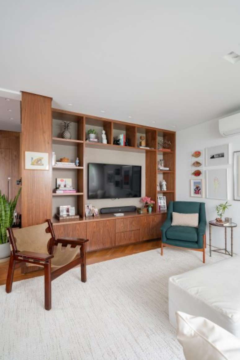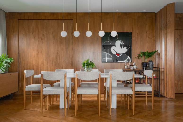 Já o living e o jantar possuem materiais mais neutros e cores que funcionam tanto quando a cozinha está aberta como quando não. O painel que circunda a área social foi feito de nogueira, dando um pequeno contraste com o piso de escamas em madeira peroba mica. As portas que dão acesso aos outros cômodos do apartamento ficam todas mimetizadas nesse painel.