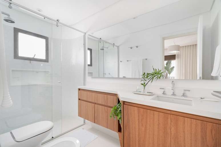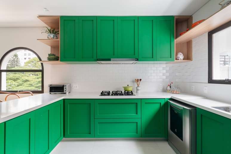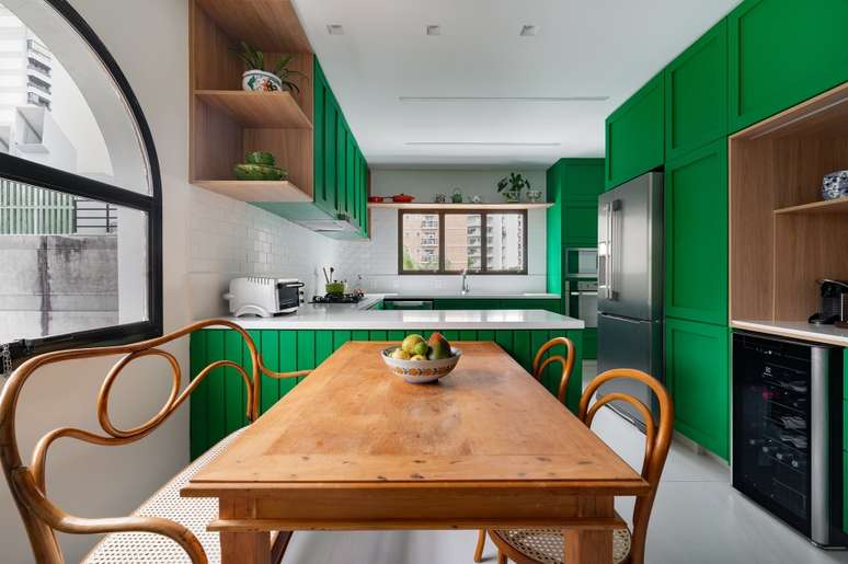 A cozinha é um destaque à parte: atendendo ao pedido da cliente, o cômodo ganhou marcenaria verde! Para equilibrar, o resto do espaço reúne materiais neutros, como bancadas de quartzo branco, backsplash revestido de subway tiles, piso de porcelanato e detalhes da marcenaria e mobiliário em freijó.