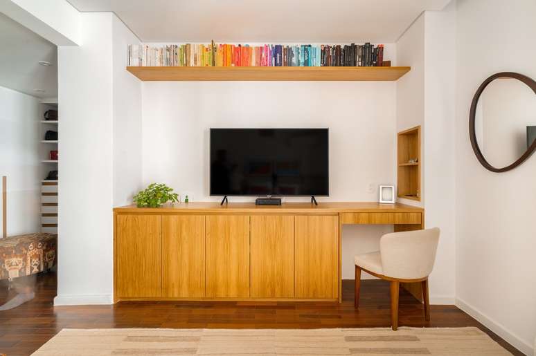 "Uma das coisas que encantaram os clientes e foi decisivo na escolha do apartamento é que ele fica na altura da copa das árvores. Decidimos tirar partido disso e aproveitar que o prédio possui jardineiras e terraços em quase todos os cômodos para integrar ao máximo o externo e o interno", conta o escritório.