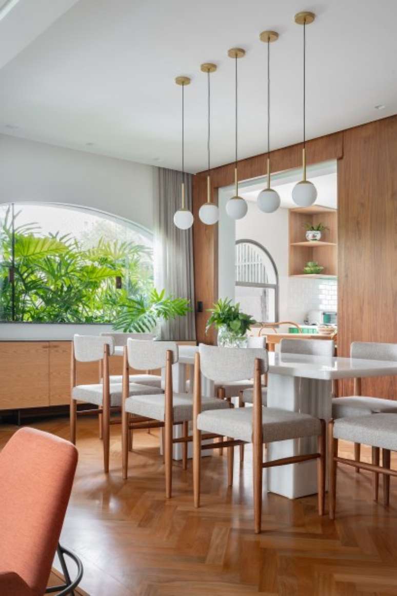 A antiga copa foi unida à cozinha, criando um ambiente maior, mais iluminado e ventilado, com a área de trabalho integrada à sala de almoço. Esse espaço também pode ser interligado à sala de jantar e living por meio de uma larga porta de correr.