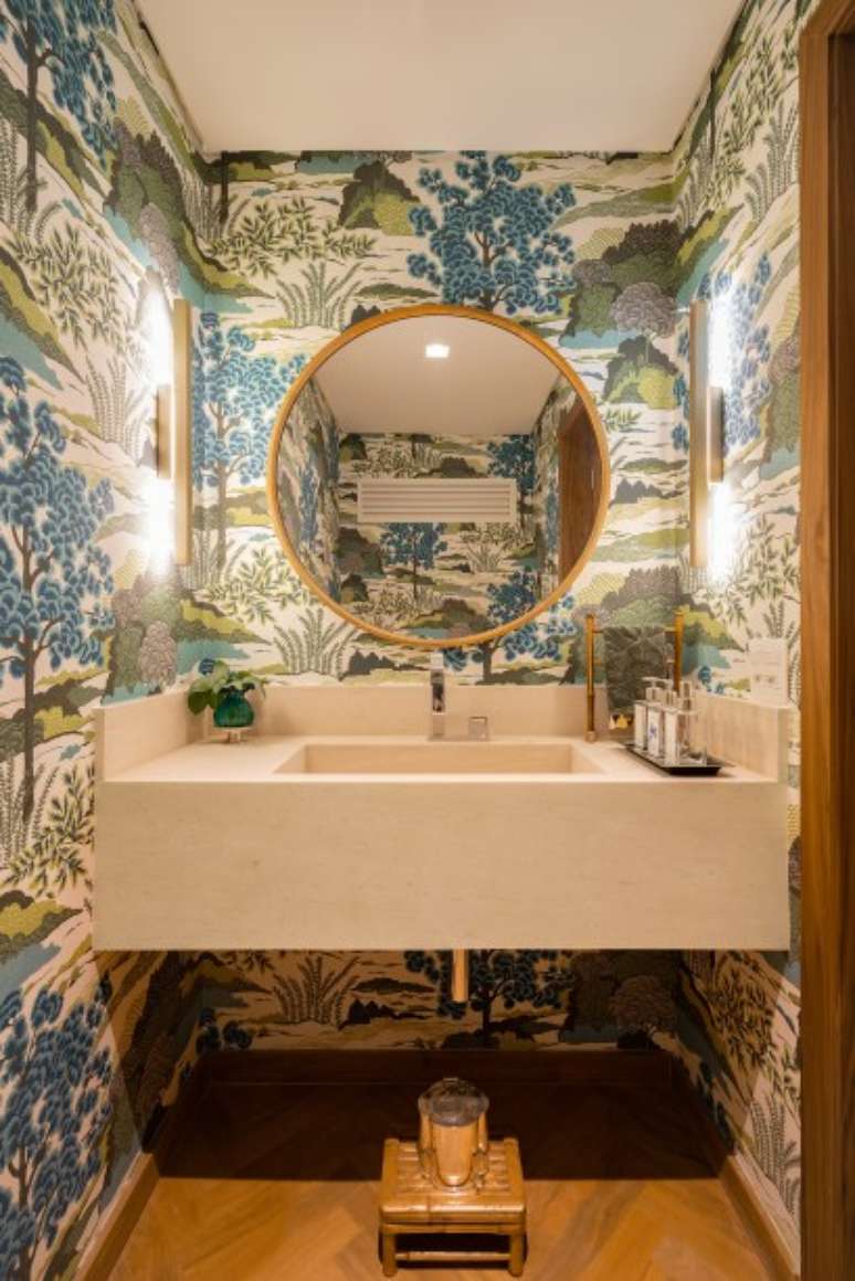 No resto da decoração, tons neutros, offwhite combinado com cores terrosas e um pouco de verde completam a paleta. O lavabo mistura clássico com contemporâneo com papel de parede que mistura padronagem clássica com cores vibrantes. A bancada com cuba esculpida em limestone mont doré levigado, as arandelas douradas e o espelho redondo fazem o contraponto na composição.