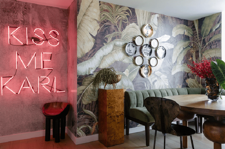 Misture os objetos – para um visual boêmio moderno em sua sala de jantar, insira camadas em estampas contrastantes, cores fortes e muita textura. Uma variedade de opções de assentos realça a aparência intencionalmente eclética, assim como uma abundância de vasos de plantas verdes.