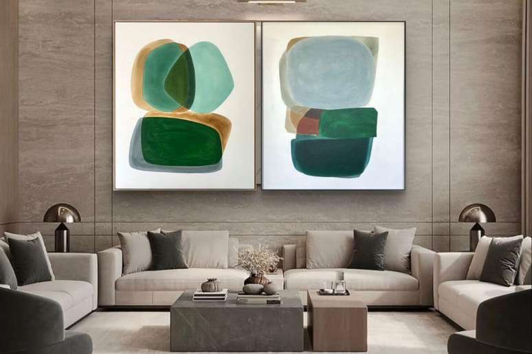 Azuis profundos, verdes-musgos e variações minerais surgem como contraponto à velocidade do cotidiano. Nas obras autorais, essas cores funcionam como campos de contemplação, especialmente em salas amplas e áreas sociais que pedem equilíbrio visual.