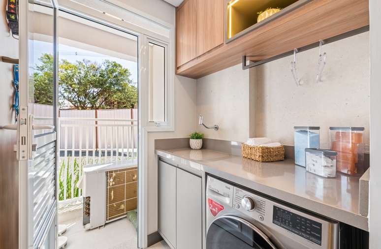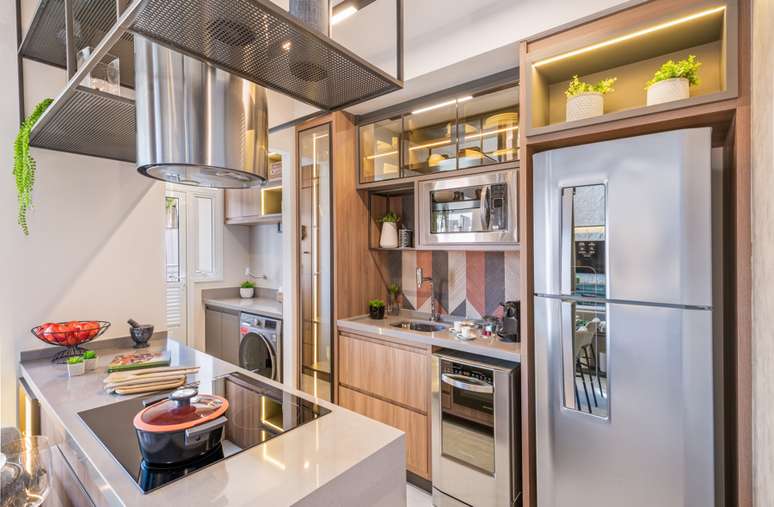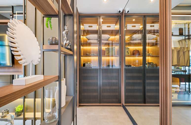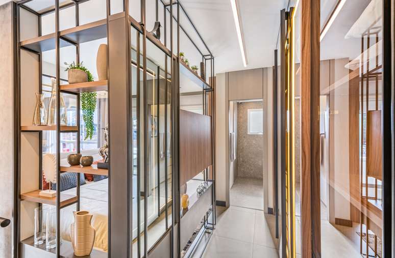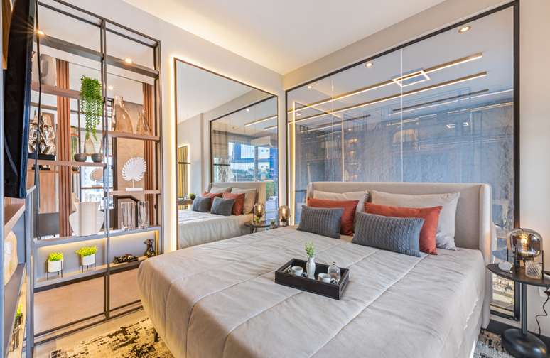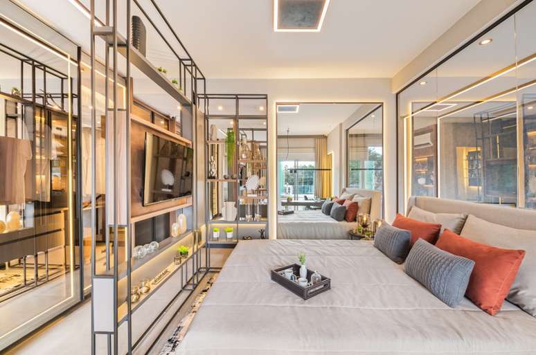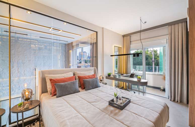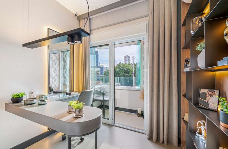 Apesar da metragem enxuta, este apartamento decorado de 75 m² é também duplex: o empreendimento Platina Norte Sul Patriani, em Campinas (SP), possui um mezanino que abriga quarto com closet e home office. "Integramos todos os espaços e não abrimos mão de uma boa iluminação nos móveis, o que, unindo com a iluminação natural do pé-direito duplo, trouxe um surpreendente resultado", explica a arquiteta Brenda Almeida, da Construtora Patriani.
