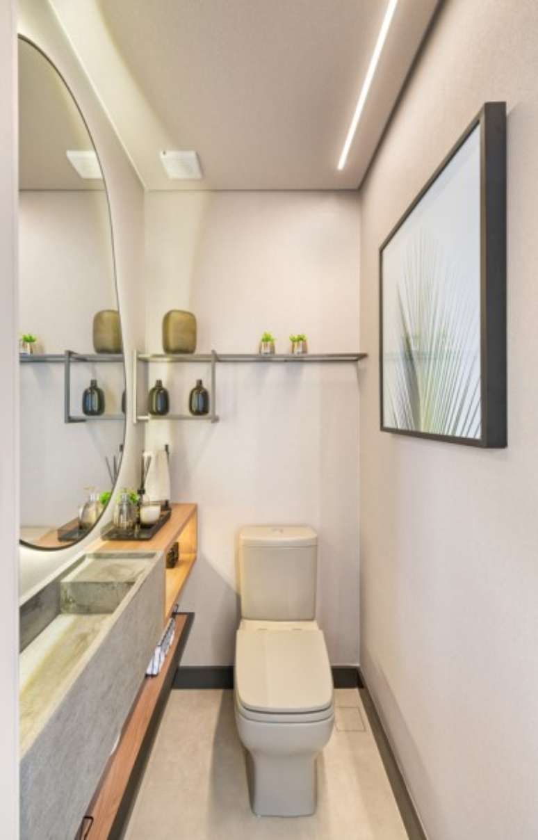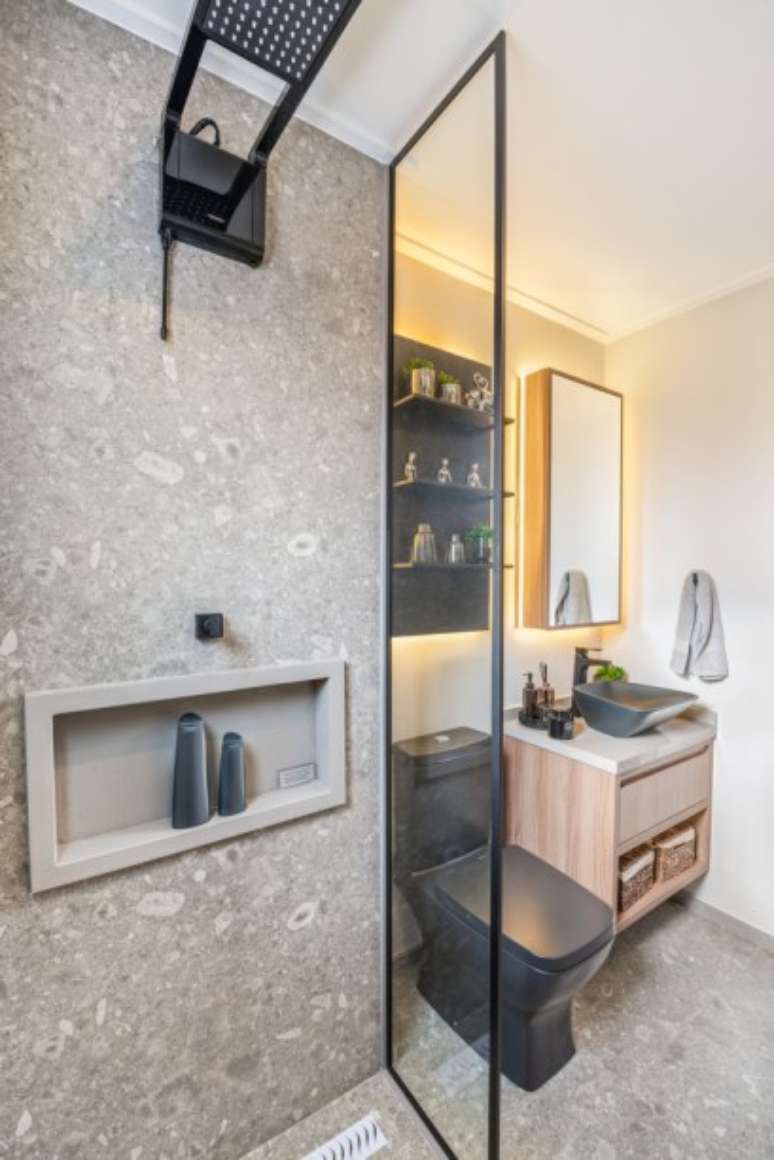 Aqui, a paleta de cores é moderna, com cinza, preto e tons de madeira média. Para dar movimento, há várias texturas, como o cimento queimado e revestimentos que se assemelham a pedra natural.