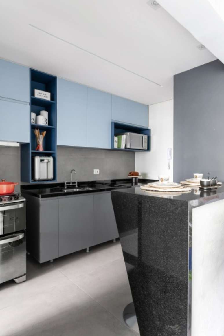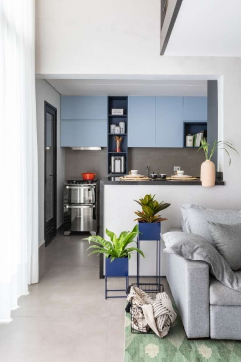 A cor aparece, principalmente, nos armários superiores da cozinha (em dois tons de azul), no tapete da sala (em vários tons de verde) e nas paredes do lavabo, pintadas com tinta azul.