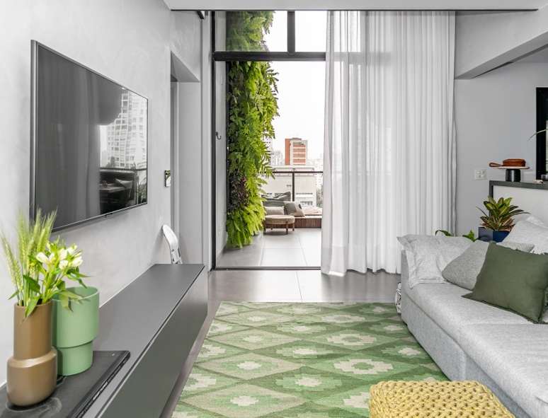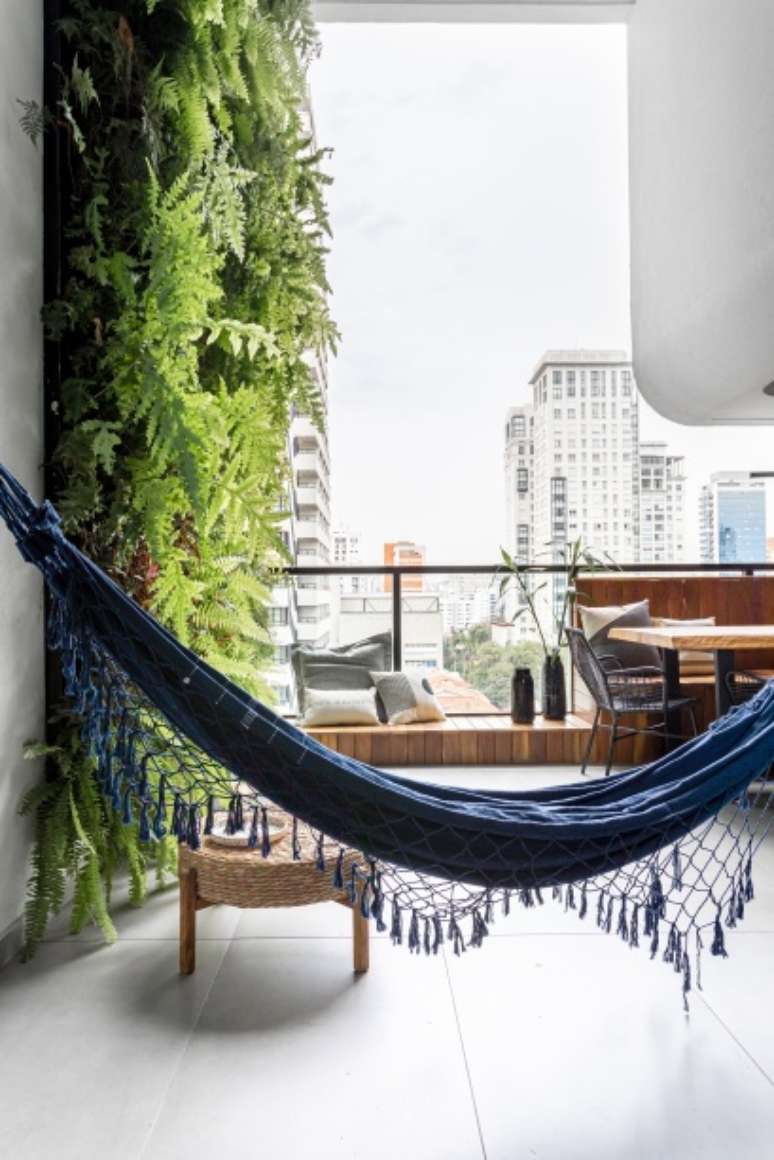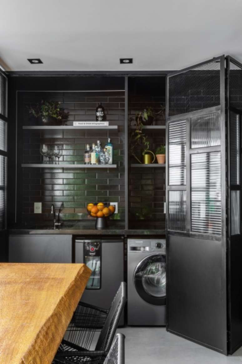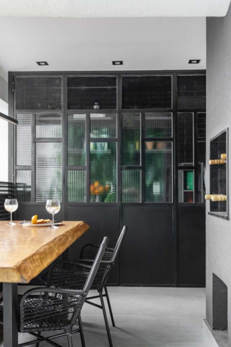 Outro destaque do projeto é a varanda, que tem 21 m². "Mantê-la aberta, como queria o cliente, e ao mesmo tempo torná-la prática e charmosa, foi um dos nossos maiores desafios", avalia Kênia. Para isso, o escritório instalou um jardim vertical de um lado e, no outro, projetou um armário de serralheria com portas-camarão de vidro canelado, que camuflam suas múltiplas funções: bar, lavanderia e apoio à mesa de refeições externa e à churrasqueira.