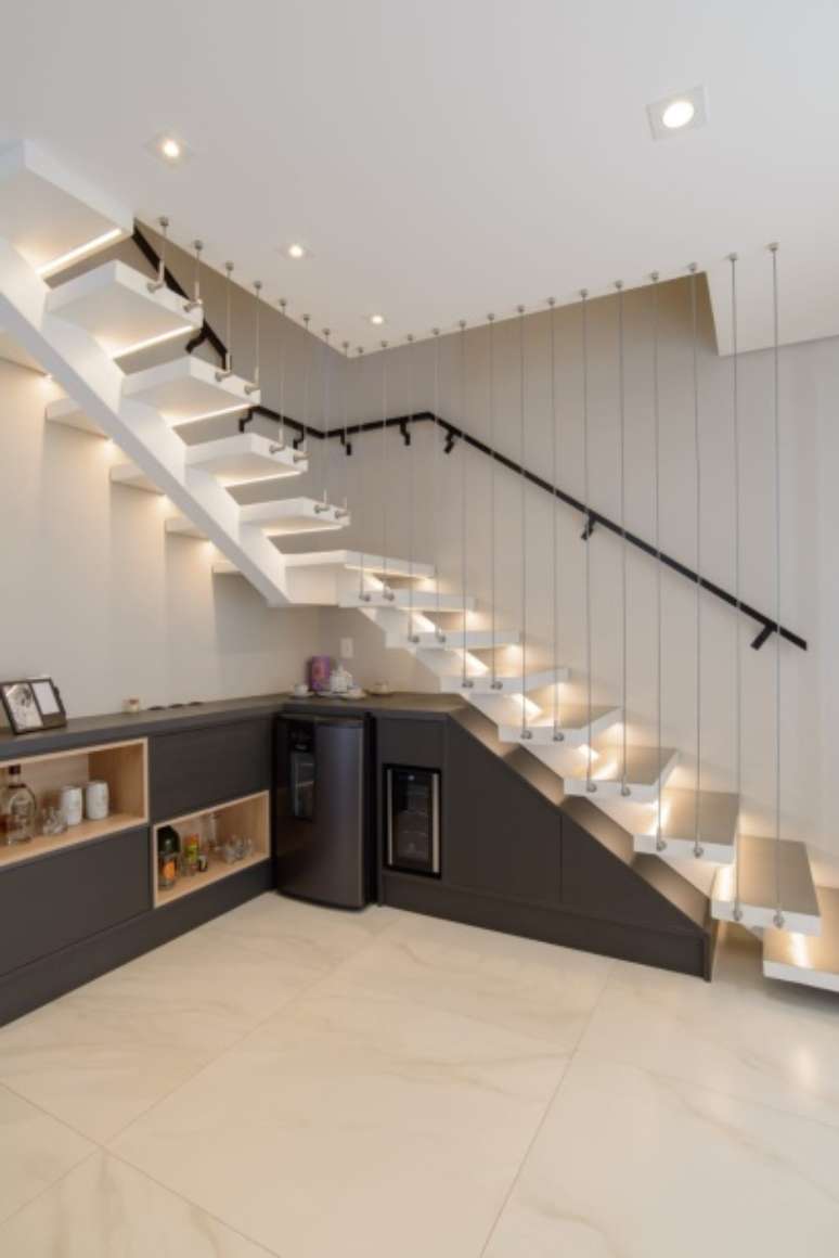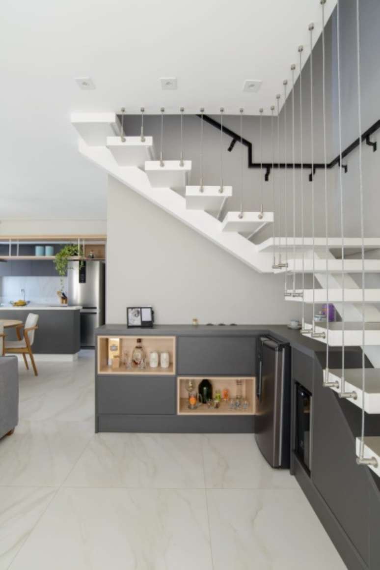 Além disso, tem os cabos de aço que fazem o fechamento de proteção e que não fecha totalmente, fazendo com que a escada integre todo o espaço social da casa e seja o grande destaque do duplex", entende Caroline.