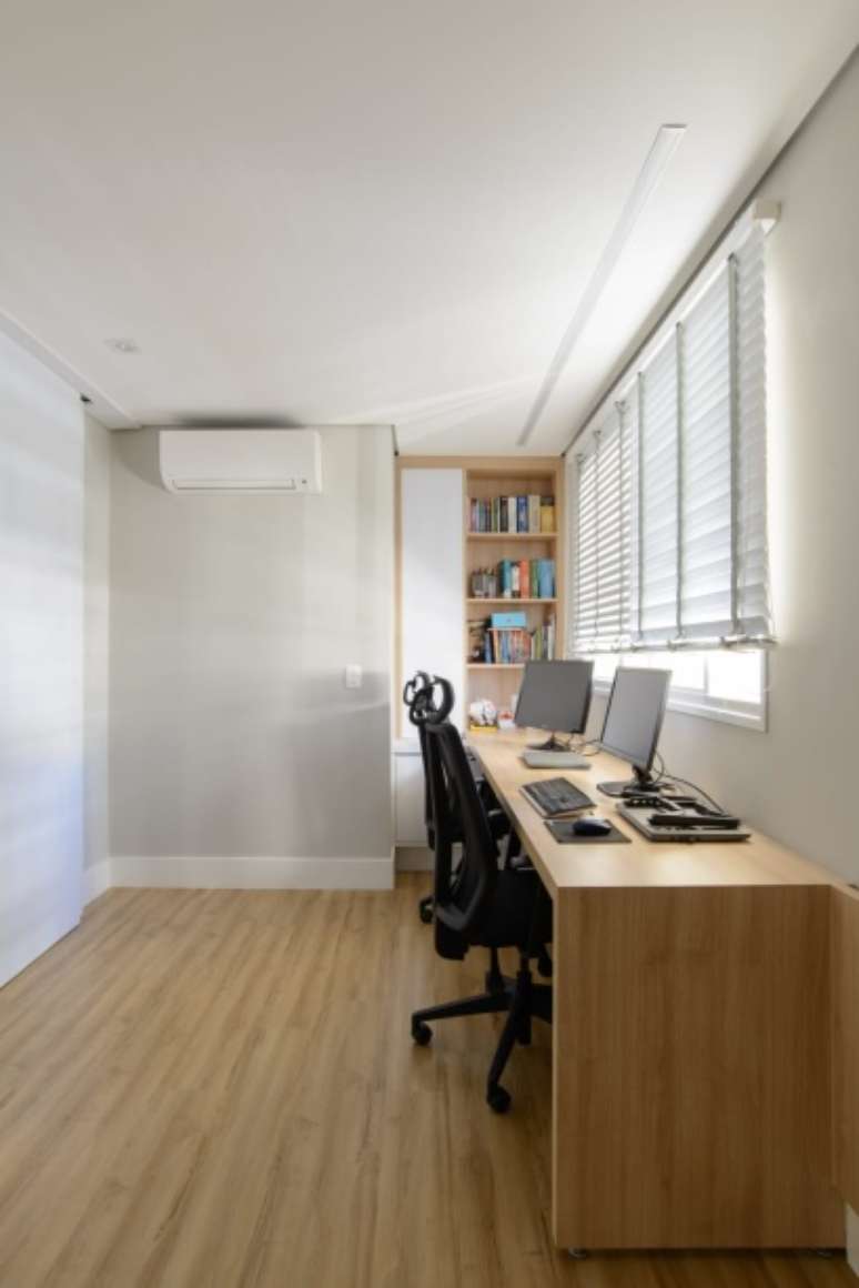 "Na planta original, o andar superior era de apenas dois quartos e um pé direito duplo na sala na parte de baixo. Os clientes pediram para que fosse feito um terceiro quarto, que seria um home office e o quarto de visitas.