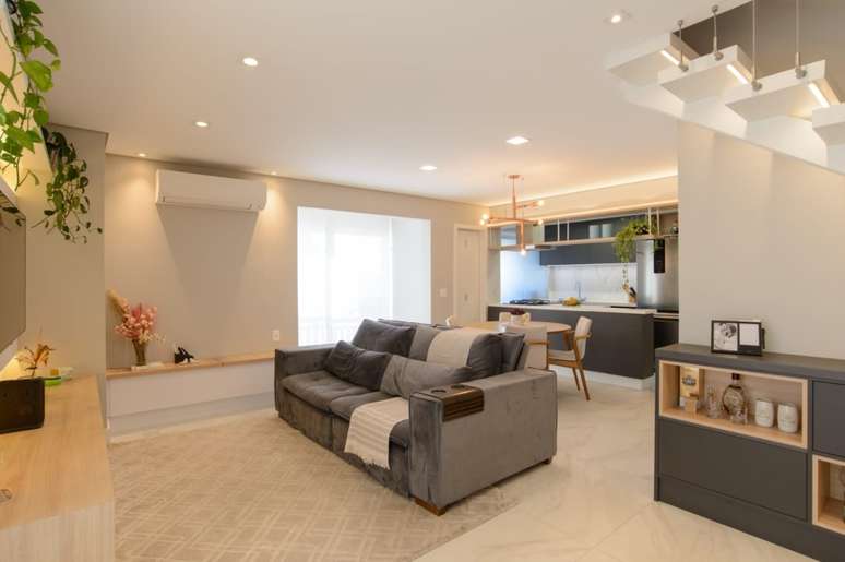 O escritório Evertec Arquitetura assina o projeto com uma escada iluminada, integração e cores neutras