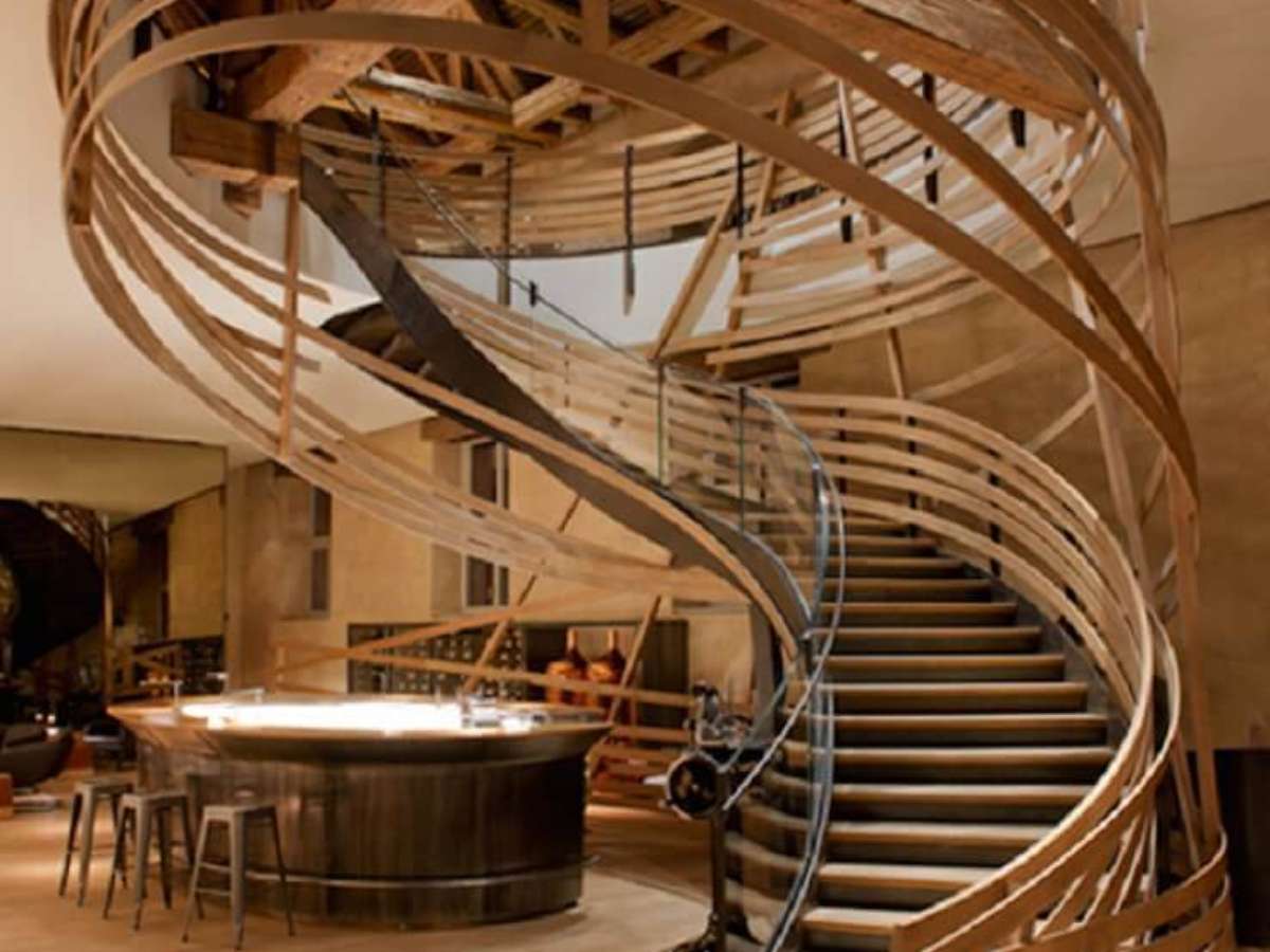 Outra ideia é investir em uma escada caracol de madeira com um design arrojado. Esses modelos de escada caracol de madeira comumente se tornam um grande destaque na decoração e é uma forma de como fazer escada de madeira para incrementar a beleza do ambiente.