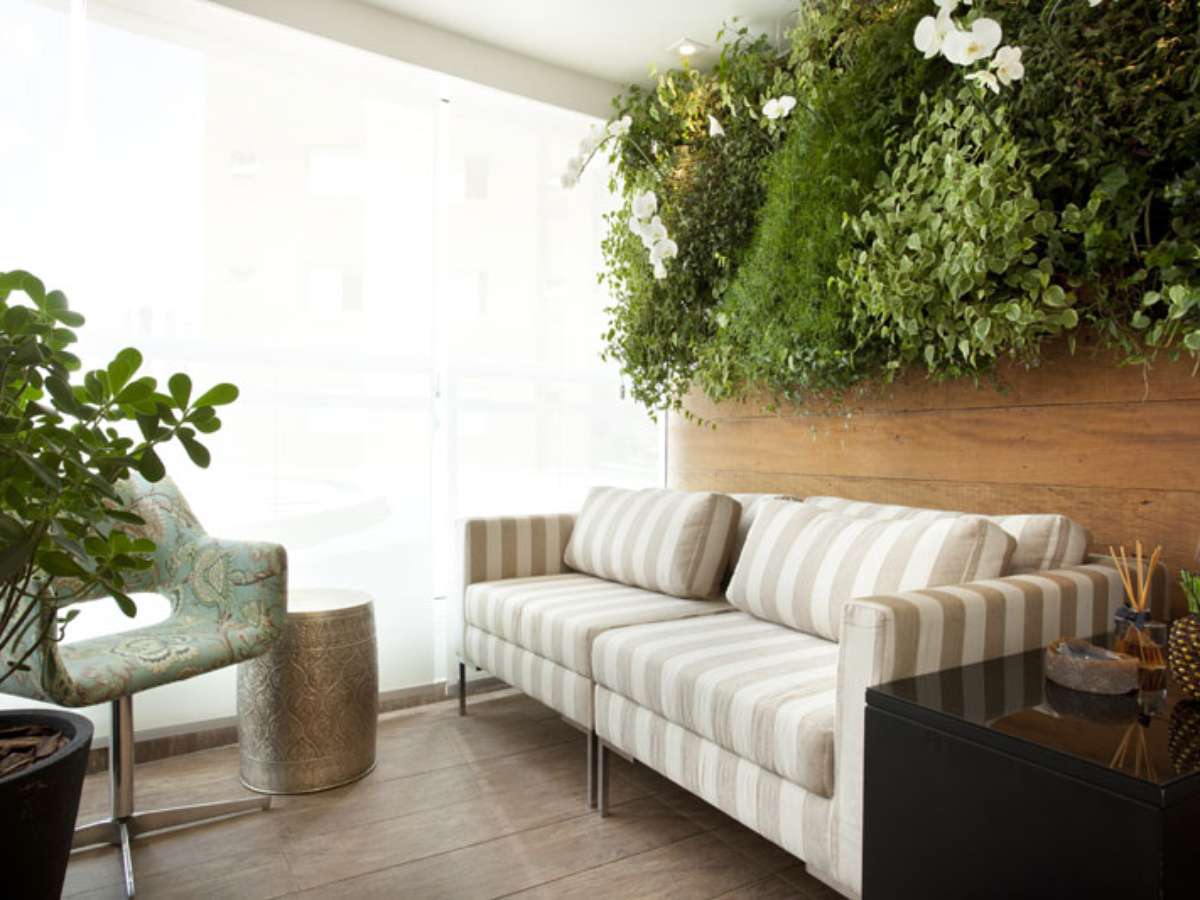 As espécies usadas foram antúrio (detalhe da foto), primavera, mini romã, castanheira, gerânio vermelho e dracena. As peças verdes são chamadas garden city, espécie de banquinhos de cerâmica que servem como banco mesmo ou apoio lateral de uma poltrona ou sofá.