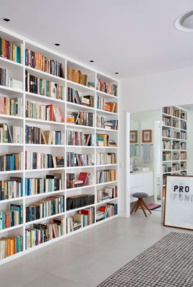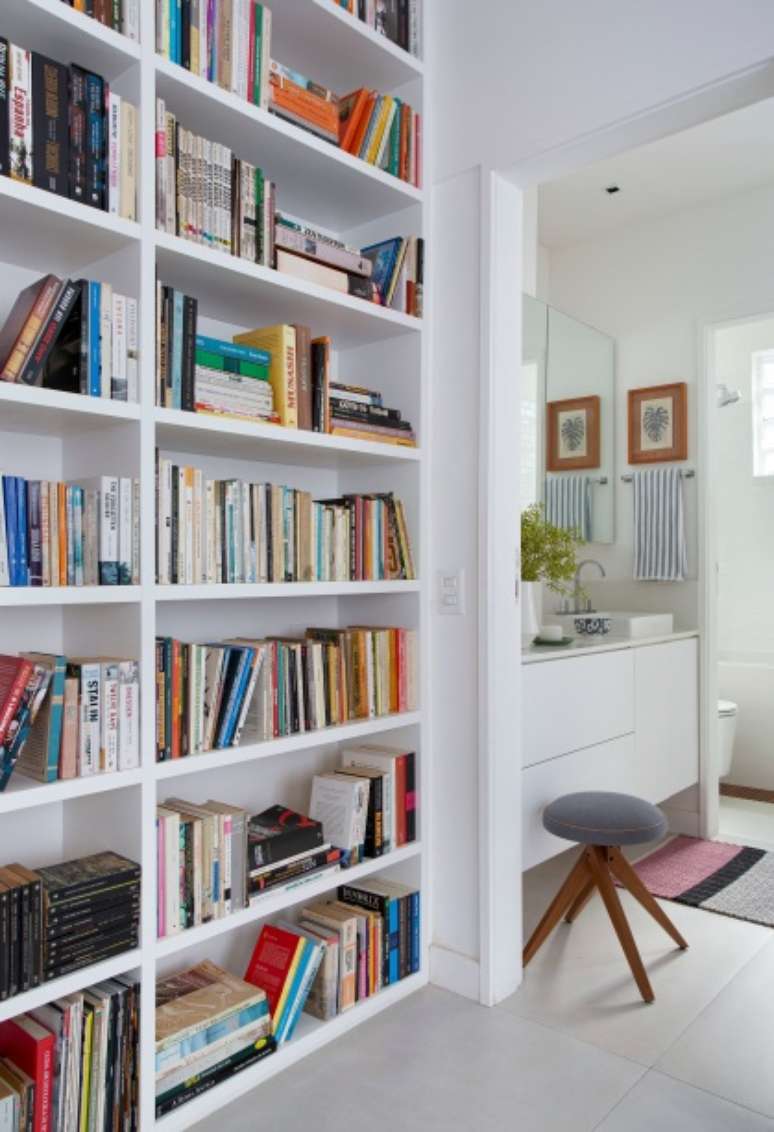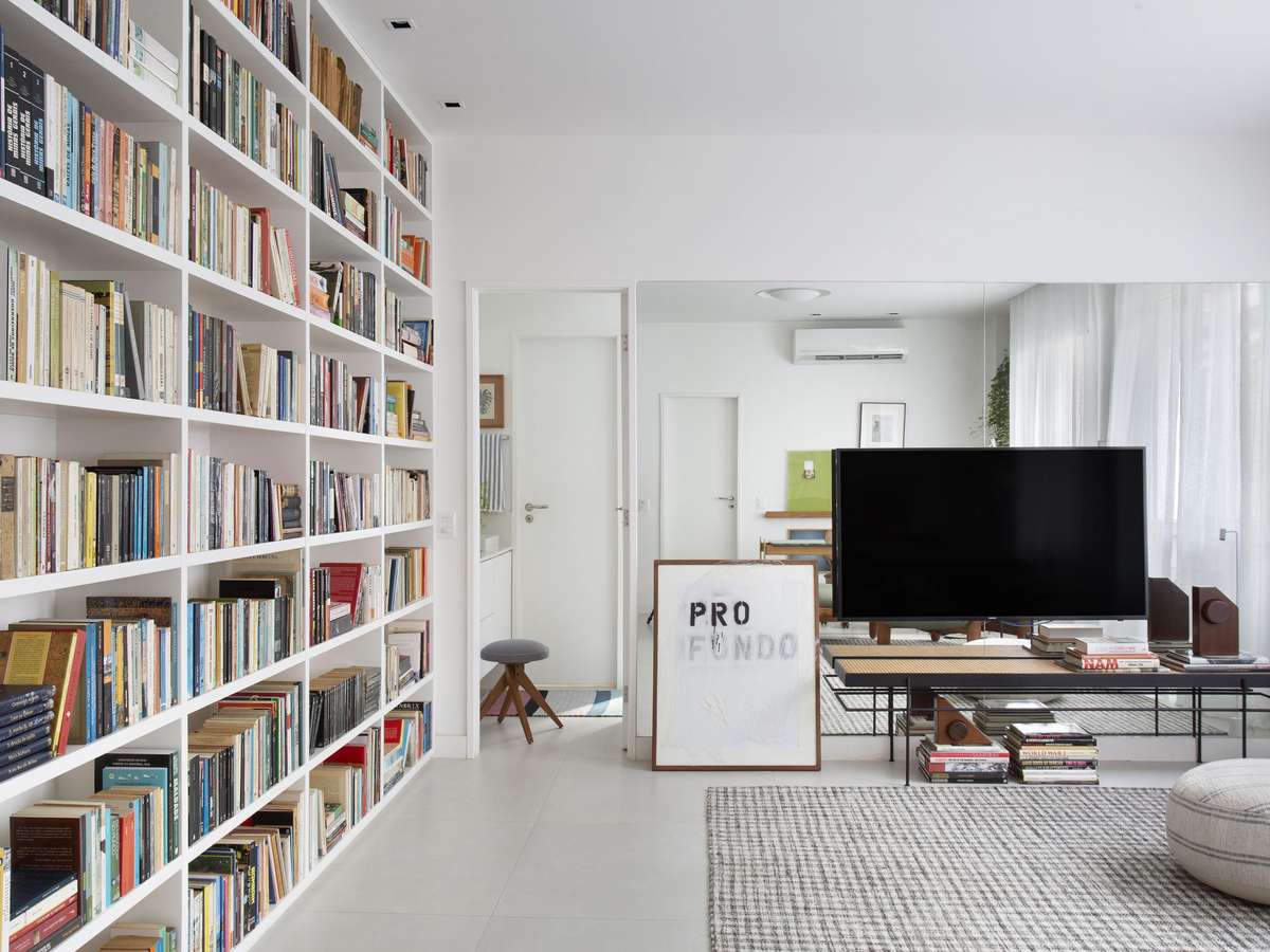 Estante com mais de 1.500 livros é destaque deste apê de 60 m² no Rio