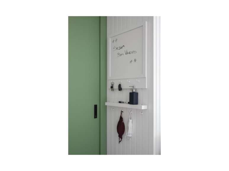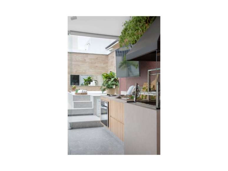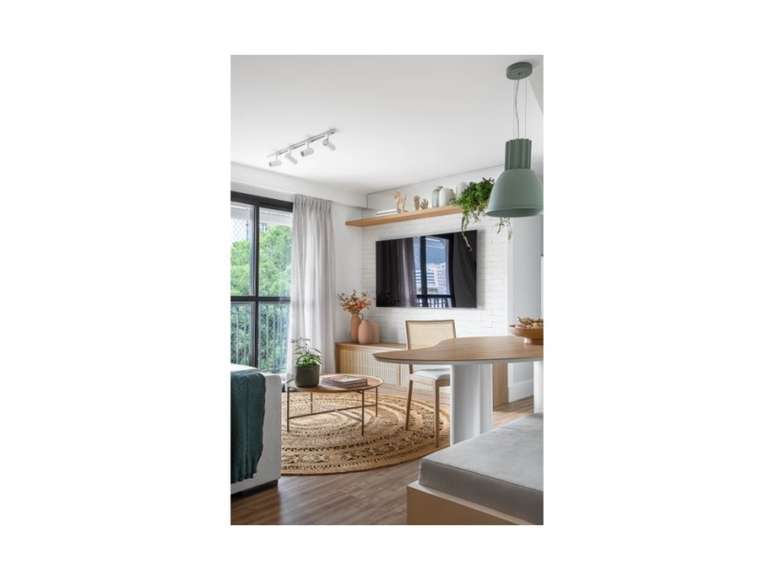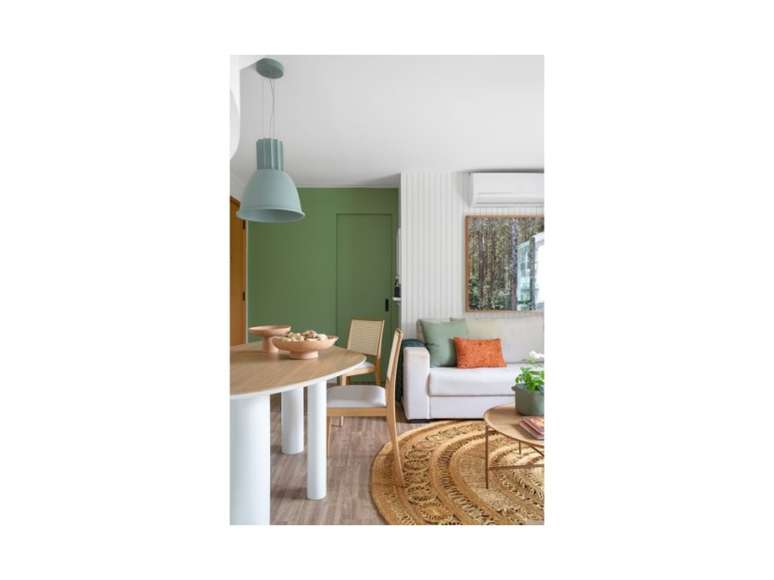 A arquiteta conta ainda que se inspirou na arquitetura escandinava, com um toque de boho-chic, para definir o conceito do projeto, mesclando cores claras e tons terrosos associados ao verde com materiais que remetem à natureza, como a palha natural - presente em luminárias, portas de armários e tapetes -; o porcelanato que imita textura de rocha; e as plantas.